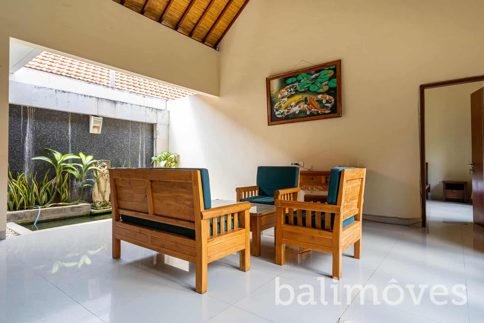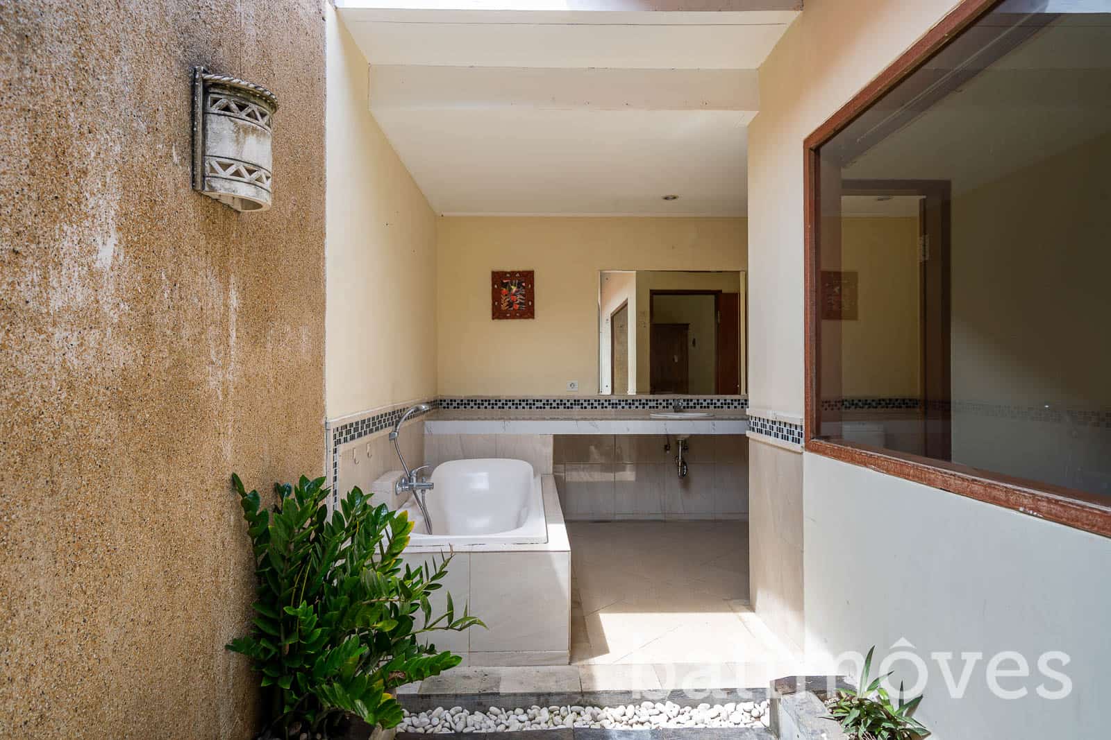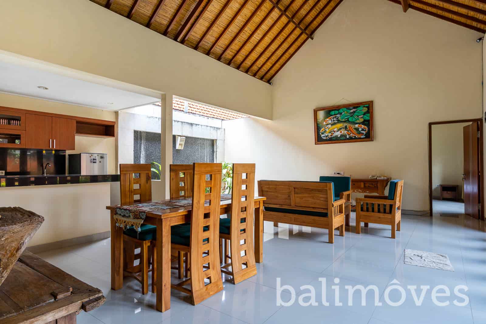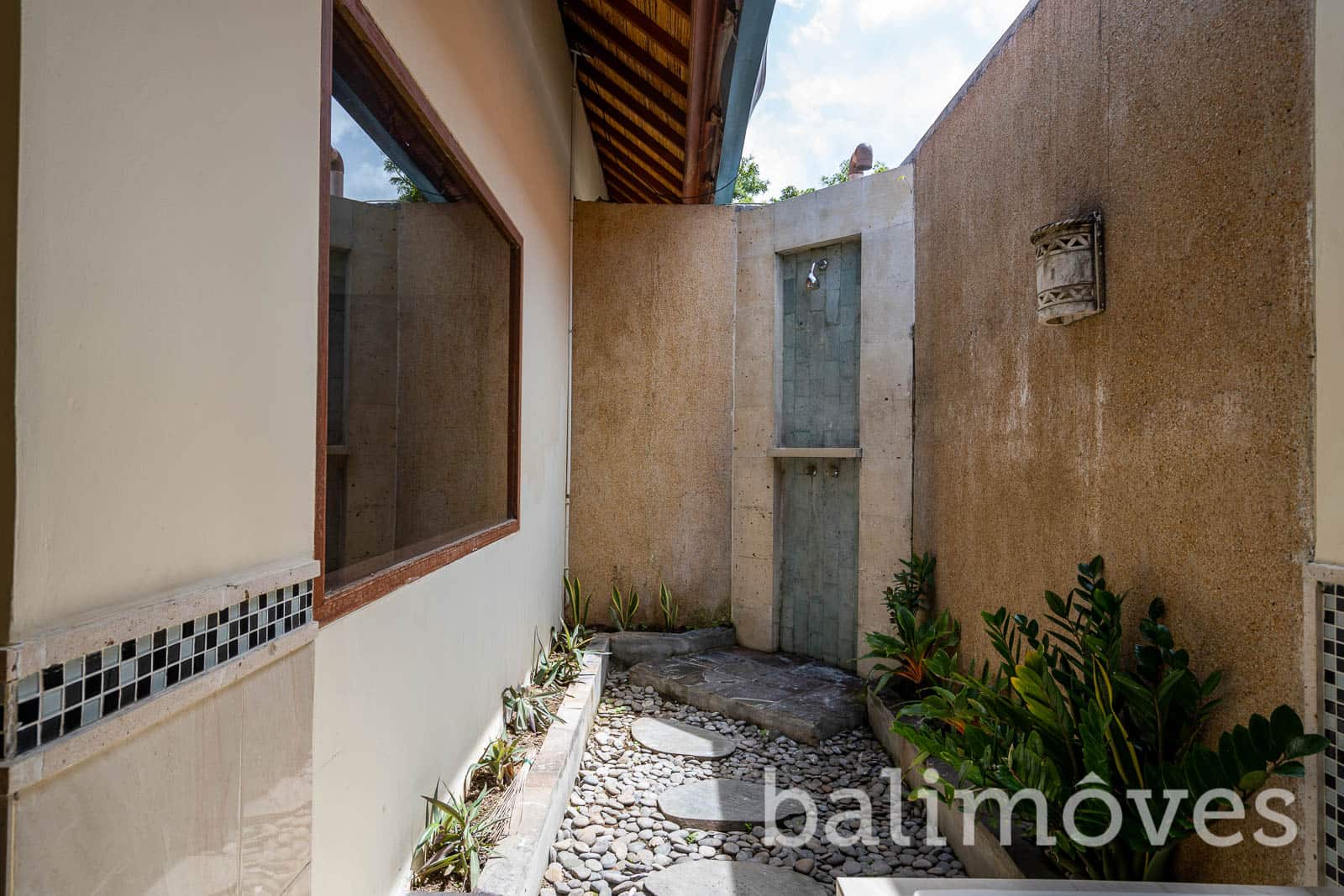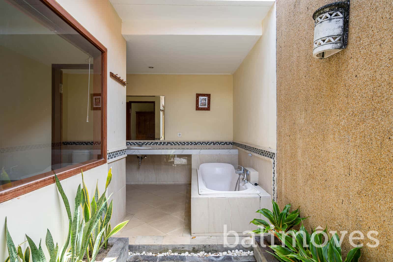 This villa was build 4 years ago on the 2,5 are land in total and 1,5 are building style, it is designed modern mixed with traditional style and this type of property is normal in Bali you probably knew it anyway 😀 this property has offered an uncovered parking space that can fit up to 1 car and motorbikes, you will find a little path when you arrive on this property that will lead to the garden, swimming pool, and the main building, it has a bright open living room and dining area with a fully-fitted kitchen that comes up with HOB, fridge, and oven, there is also a small fish pond just next to the kitchen area, full of floor-to-ceiling windows and big sliding doors on the rooms and the living area makes it bright and got enough sunlight to the entire corner of this property, it consists of two furnished bedrooms with an ensuite bathroom each fitted with a bathtub and an open-air shower. This villa will come up with furnished.