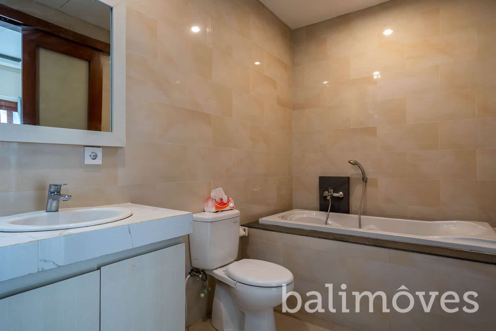 This villa was built in 2019 on the 150m2 land size and 100m2 building size, it has designs with modern style and residence living concept with big glass sliding doors which makes this villa bright on the day time, it is consists of two-bedroom with an ensuite bathroom each, the master bedroom is fitted with a bathtub and shower and the second room fitted with a shower. It is also has offered 1 guest toilet, a closed living room that faces the pool, a modern kitchen set with HOB and fridge, and storage.