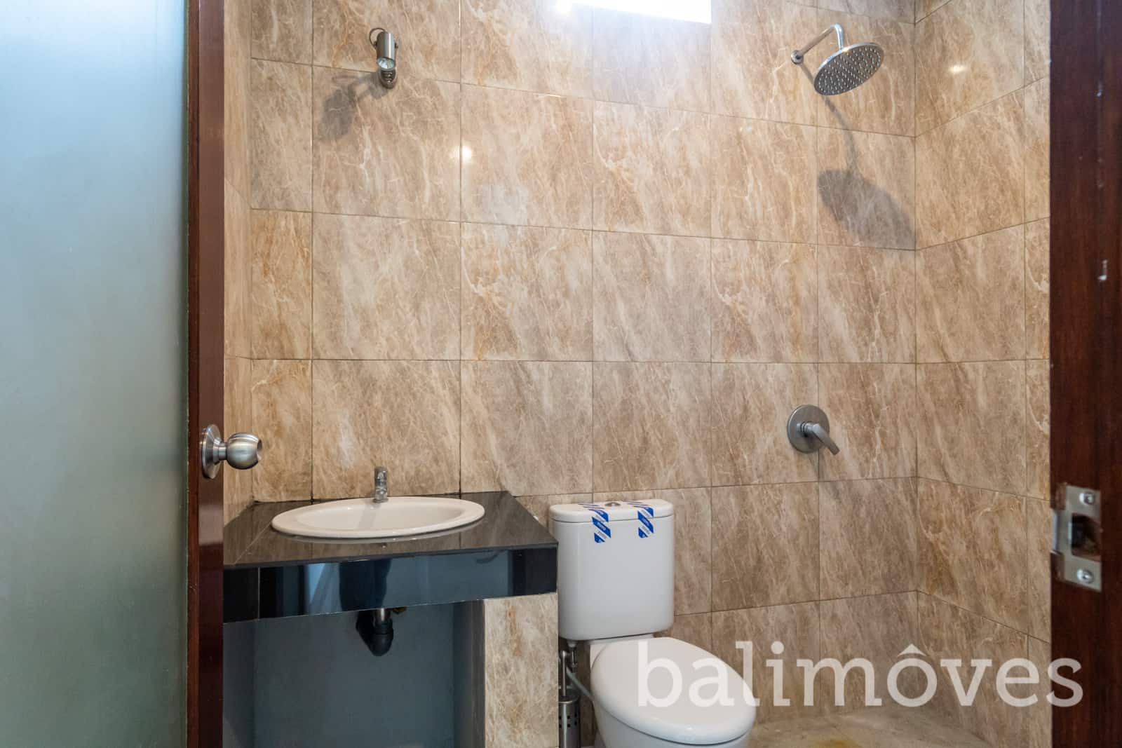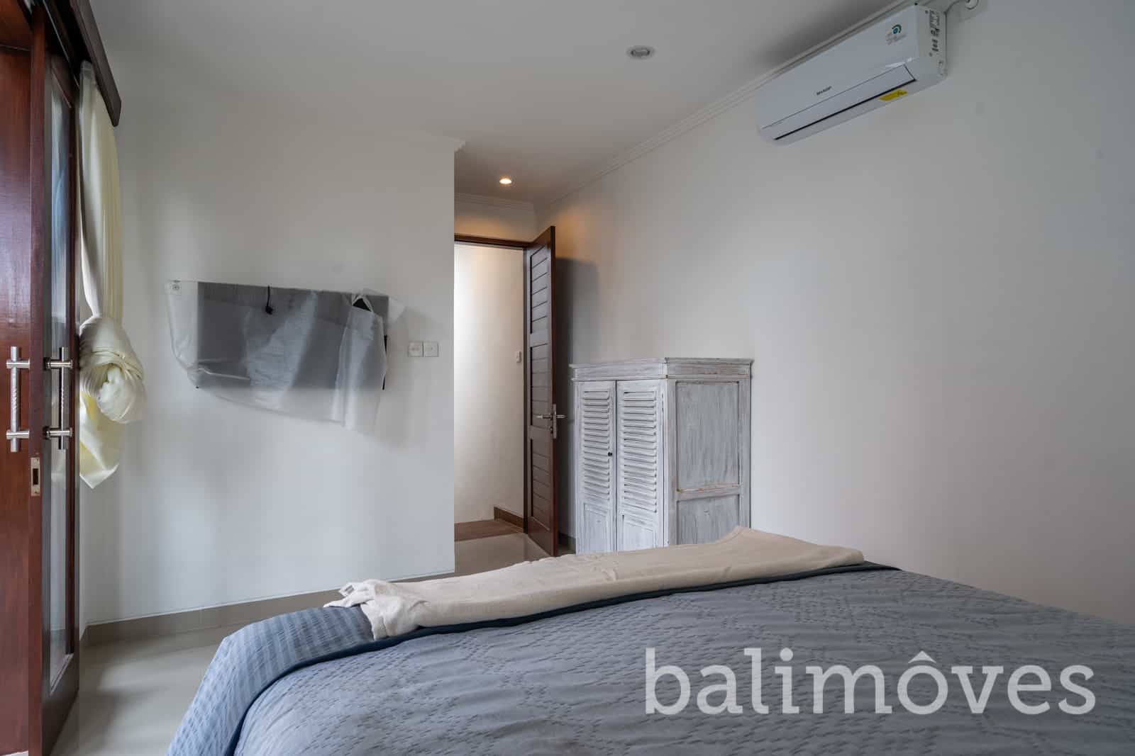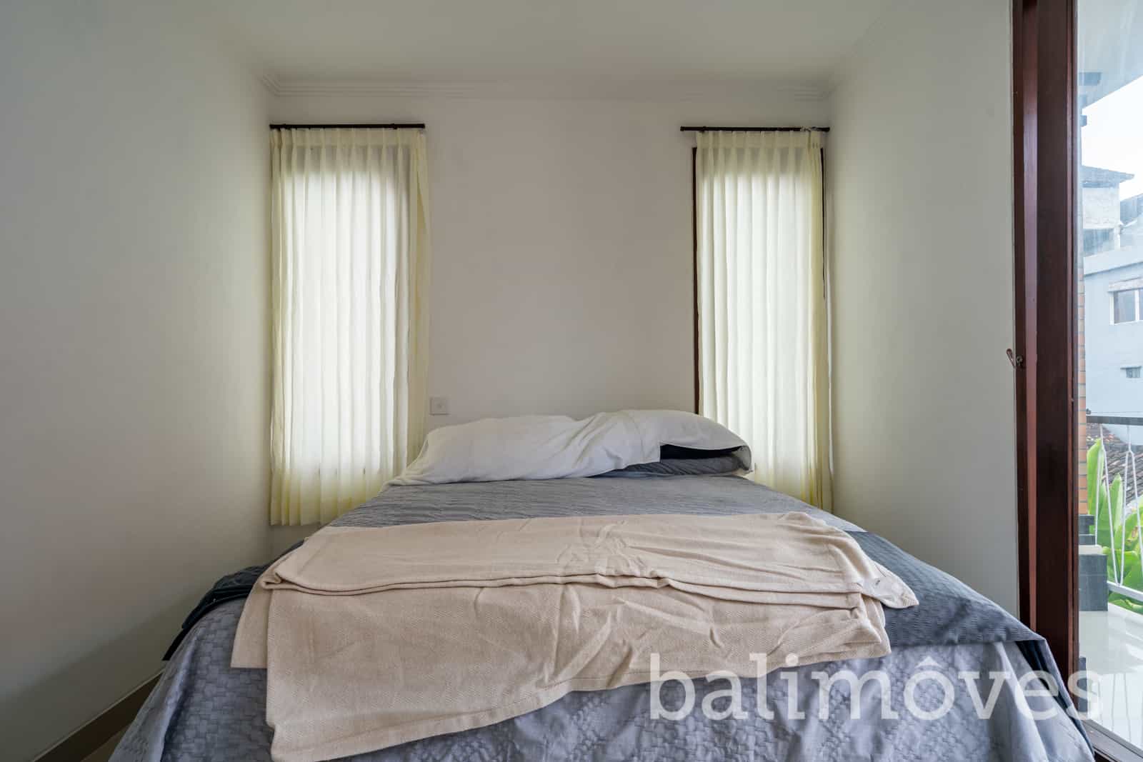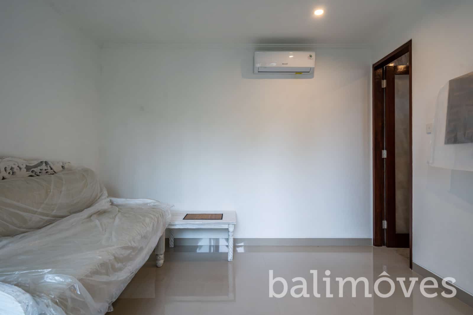 The villa offers two levels building that consisted of two bedrooms, the master bedroom located on the second floor offers furnished with an ensuite bathroom fitted with a bathtub and shower it also has a private balcony. The first level has offered a minimalist closed living room that connected to the dining area and the kitchen. The second bedroom located on the first floor facing the pool with an ensuite bathroom fitted with a shower, as you can see from the photos and video above, the second bedroom does not have any bed but don’t worry about it once the new tenant move in the owner will provide it. The villa was built in 100m2 land and 85m2 building size.