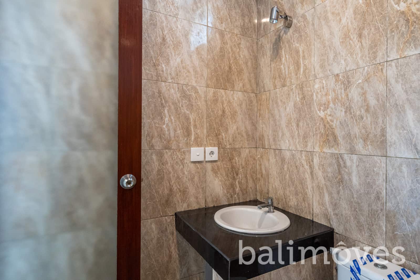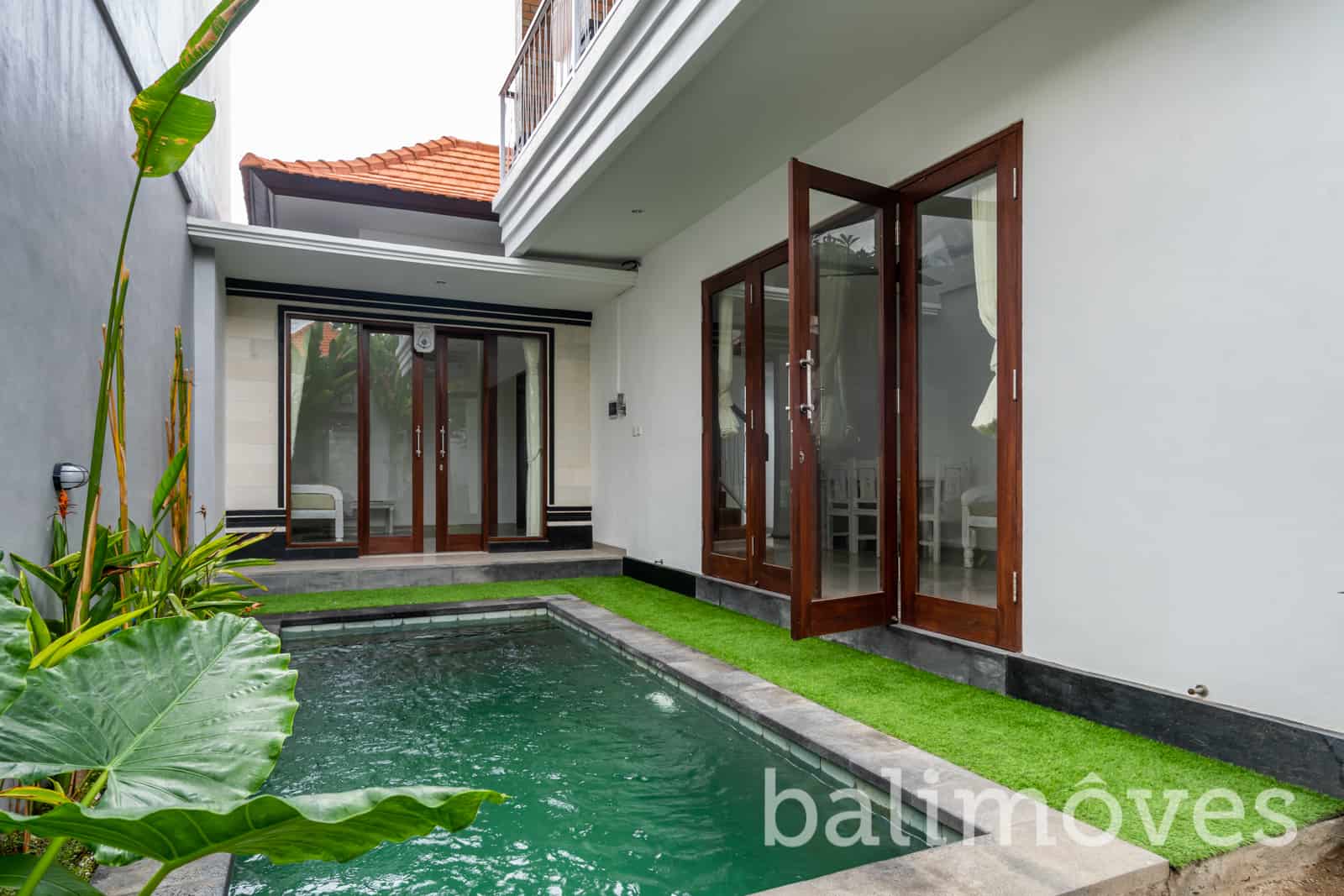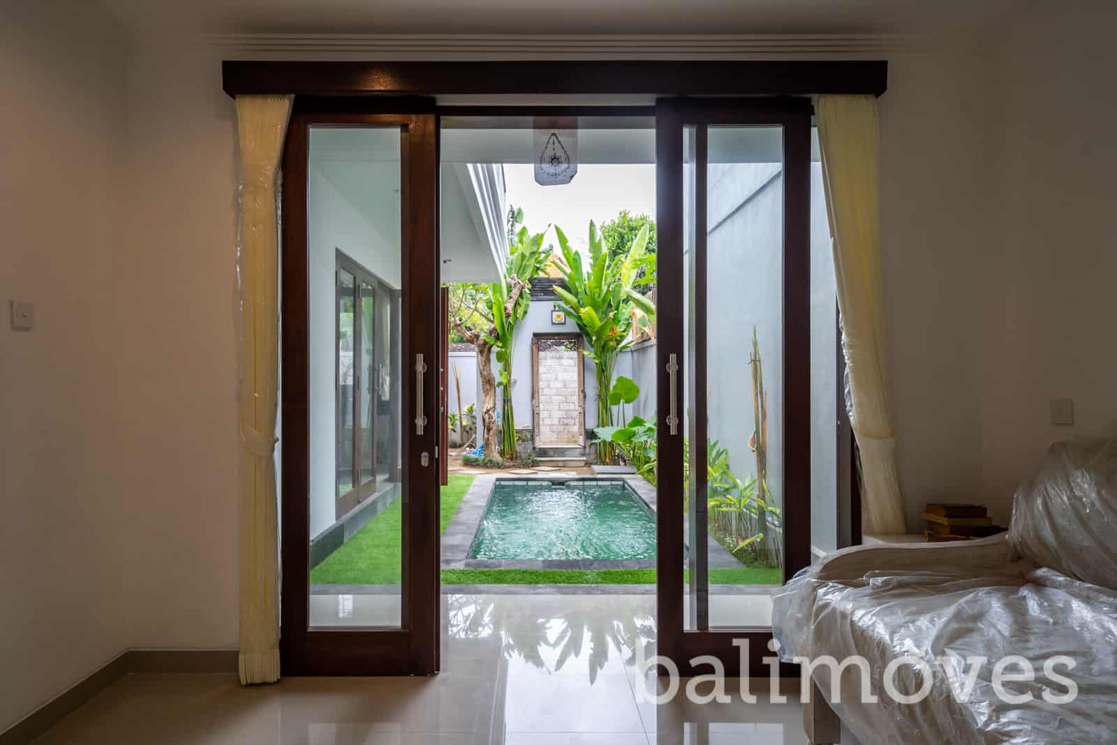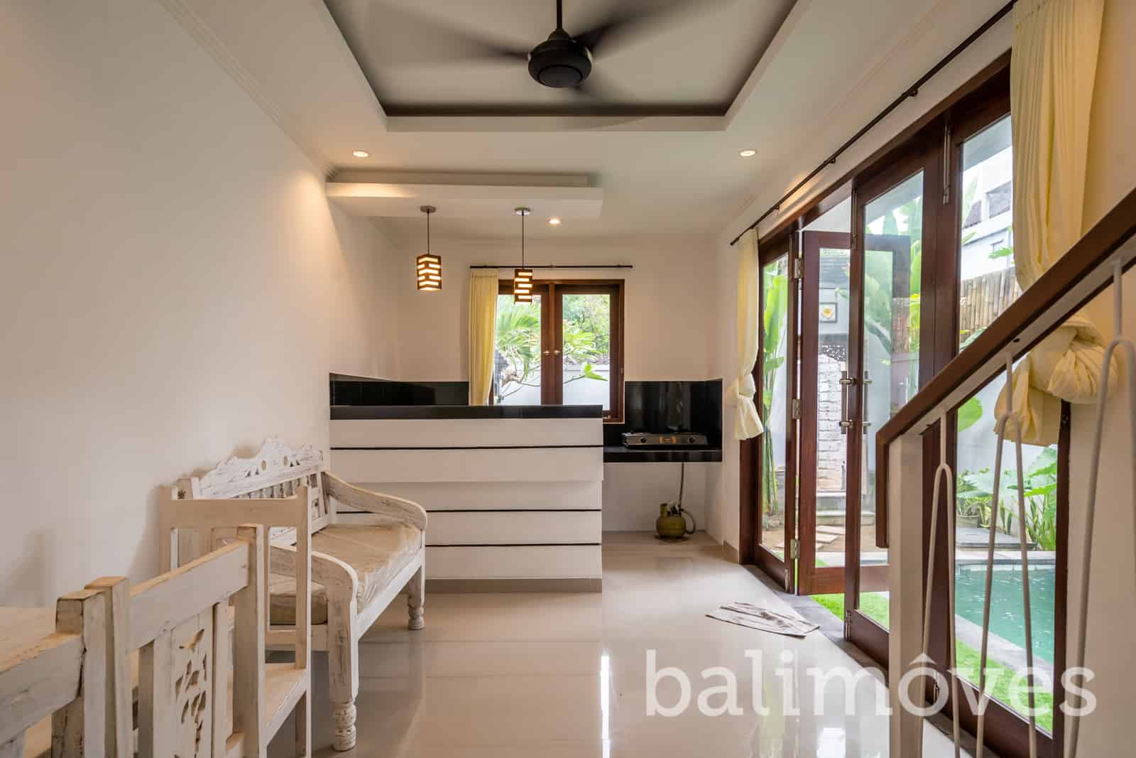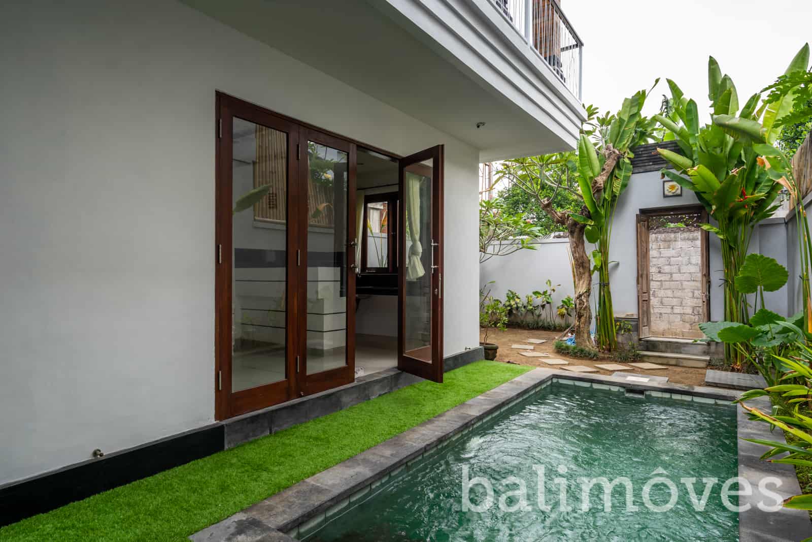 The villa offers two levels building that consisted of two bedrooms, the master bedroom located on the second floor offers furnished with an ensuite bathroom fitted with a bathtub and shower it also has a private balcony. The first level has offered a minimalist closed living room that connected to the dining area and the kitchen. The second bedroom located on the first floor facing the pool with an ensuite bathroom fitted with a shower, as you can see from the photos and video above, the second bedroom does not have any bed but don’t worry about it once the new tenant move in the owner will provide it. The villa was built in 100m2 land and 85m2 building size.