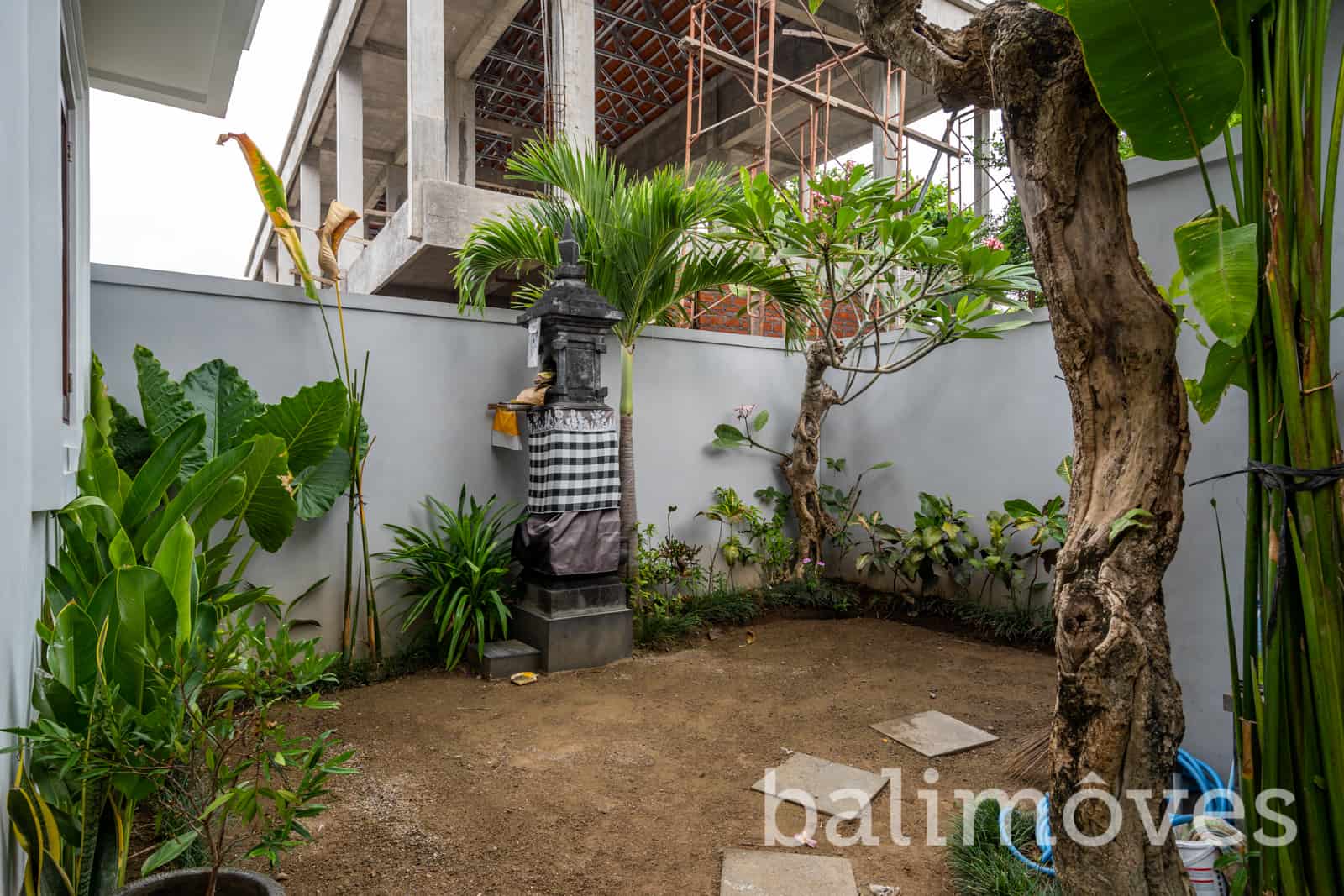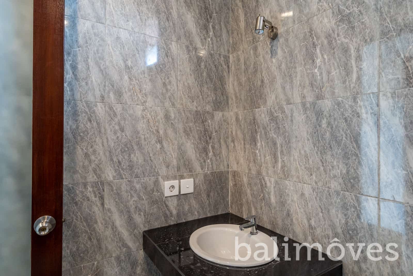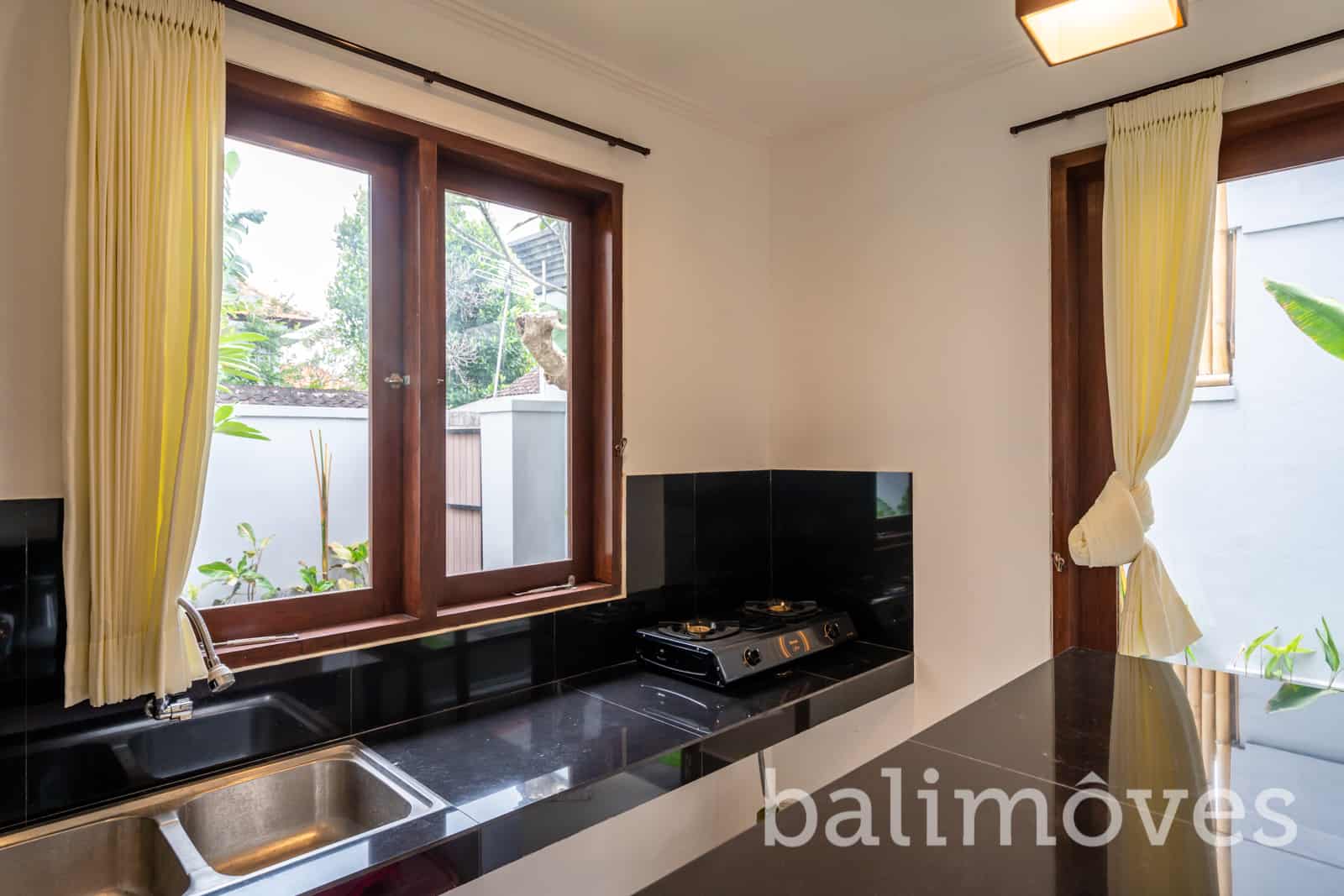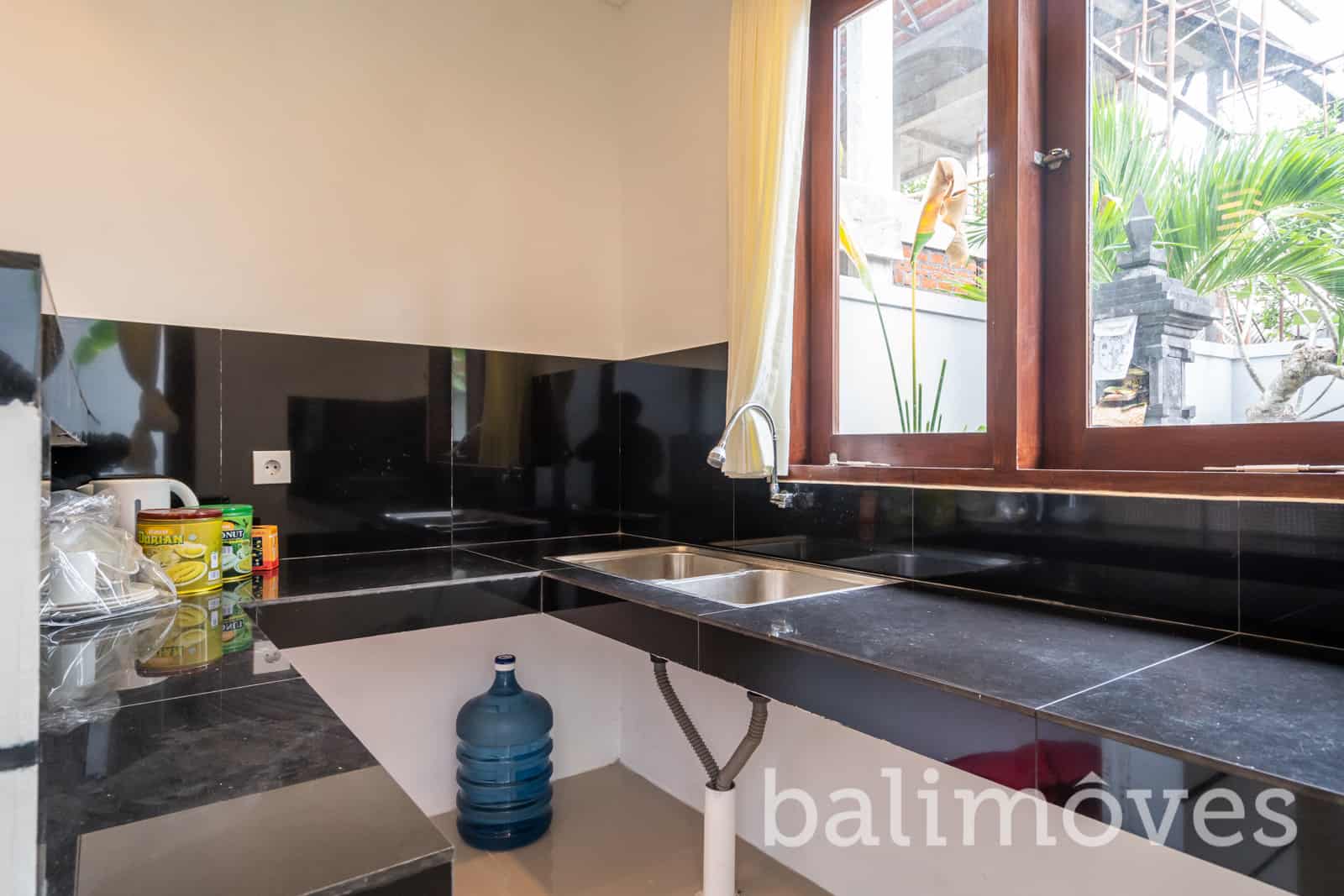 The villa offers two levels building that consisted of two bedrooms, the master bedroom located on the second floor offers furnished with an ensuite bathroom fitted with a bathtub and shower it also has a private balcony. The first level has offered a minimalist closed living room that connected to the dining area and the kitchen. The second bedroom located on the first floor facing the pool with an ensuite bathroom fitted with a shower, as you can see from the photos and video above, the second bedroom does not have any bed but don’t worry about it once the new tenant move in the owner will provide it. The villa was built in 100m2 land and 85m2 building size.