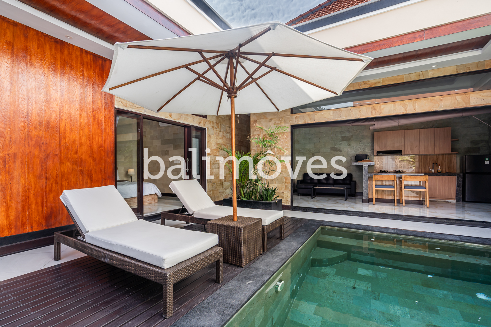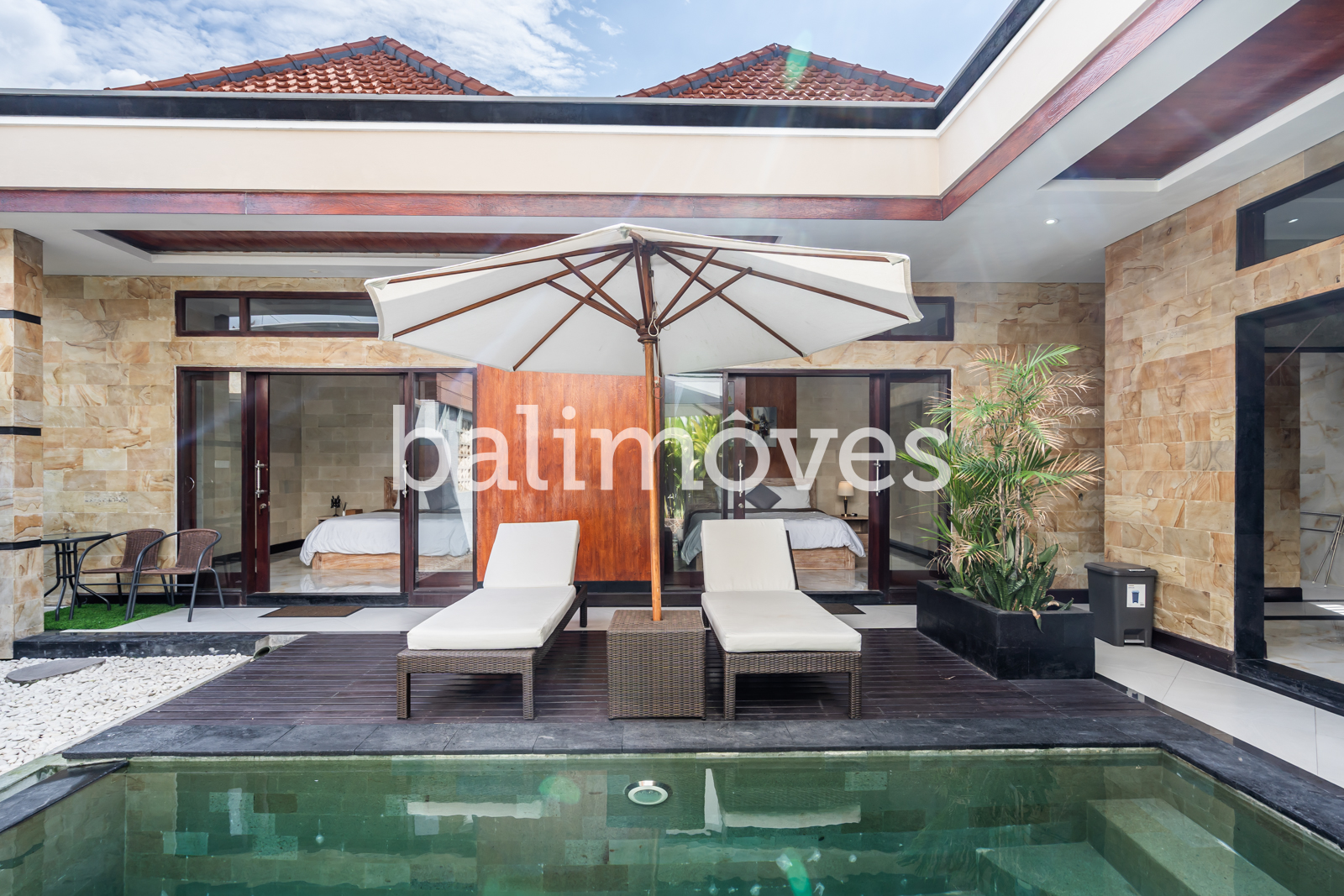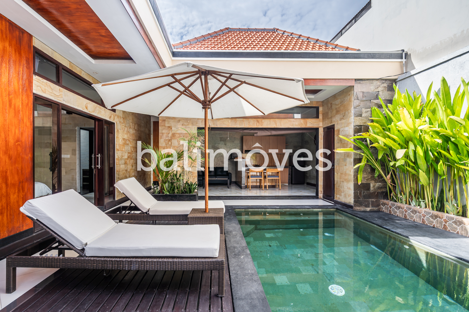 The layout of the villa is very simple. From the entrance and car park into the house you will immediately find a swimming pool. There is two bedrooms side by side with en-suite. The living room, kitchen, dining room has open style with optional fabric cover that can be rolled up if you want to close the room at any time. Offered furnished with 1 washing machine, 2 AC, 2 TV, 1 fan, internet, HOB, oven and fridge.