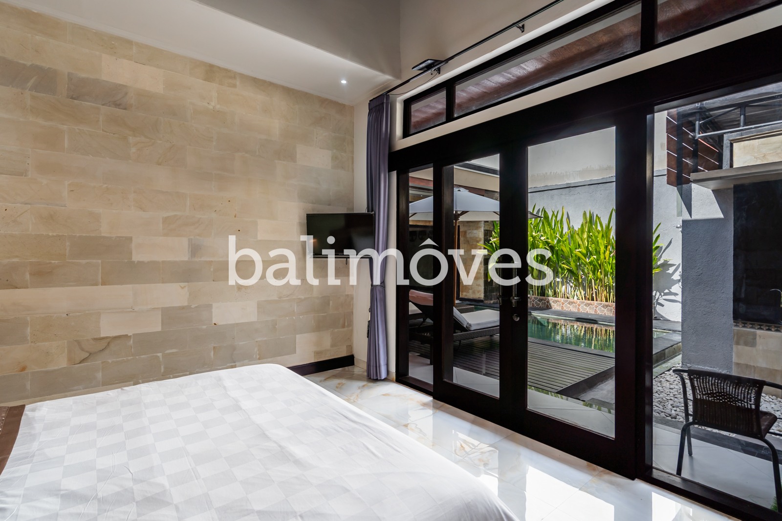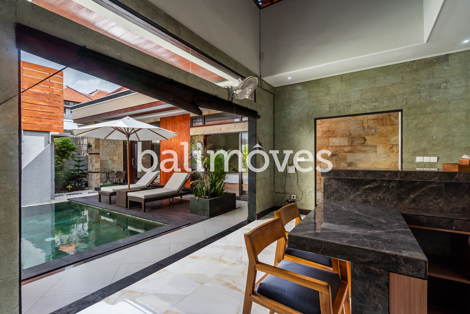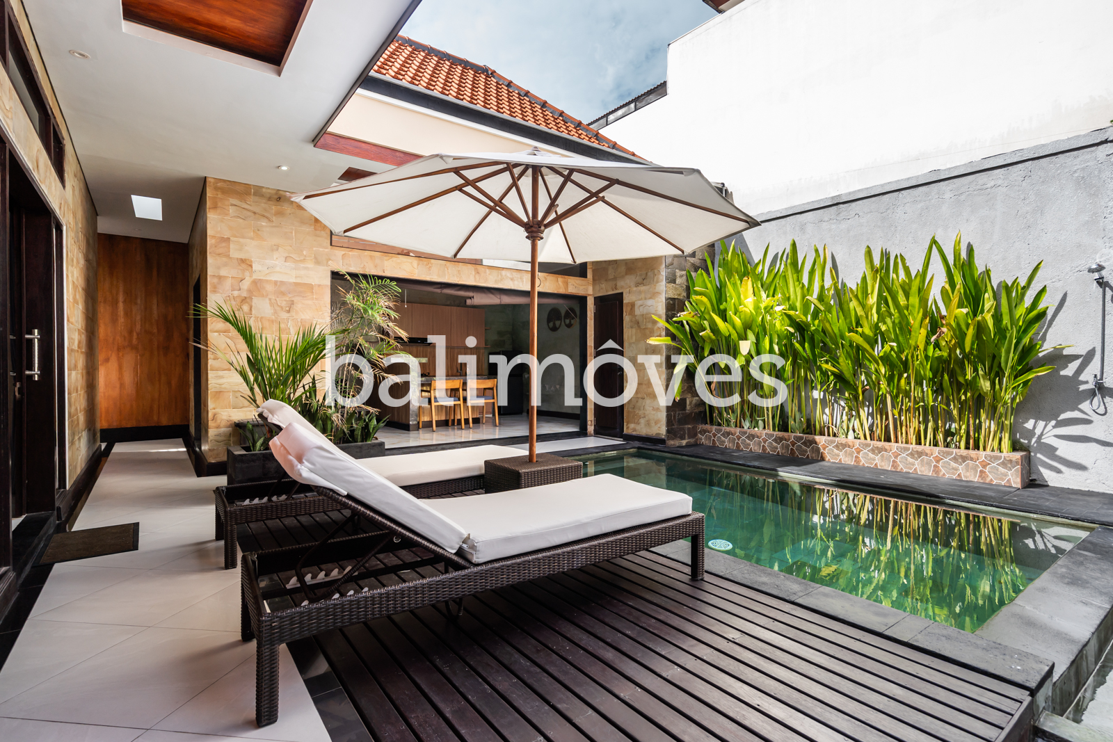 The layout of the villa is very simple. From the entrance and car park into the house you will immediately find a swimming pool. There is two bedrooms side by side with en-suite. The living room, kitchen, dining room has open style with optional fabric cover that can be rolled up if you want to close the room at any time. Offered furnished with 1 washing machine, 2 AC, 2 TV, 1 fan, internet, HOB, oven and fridge.