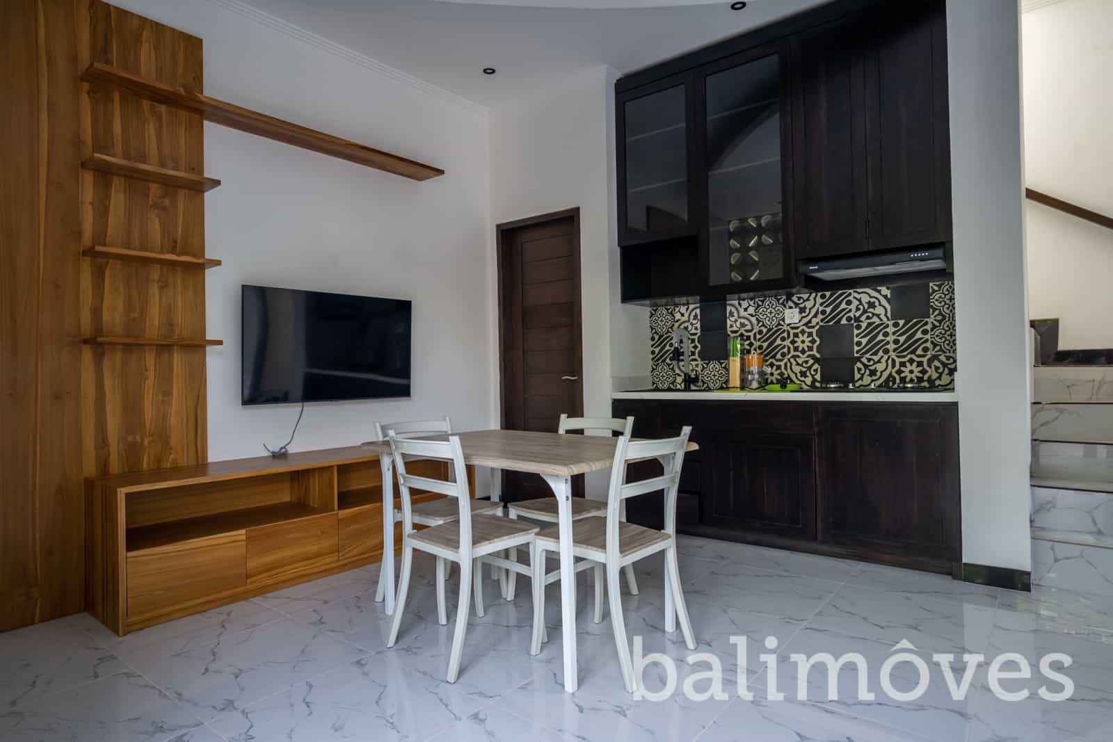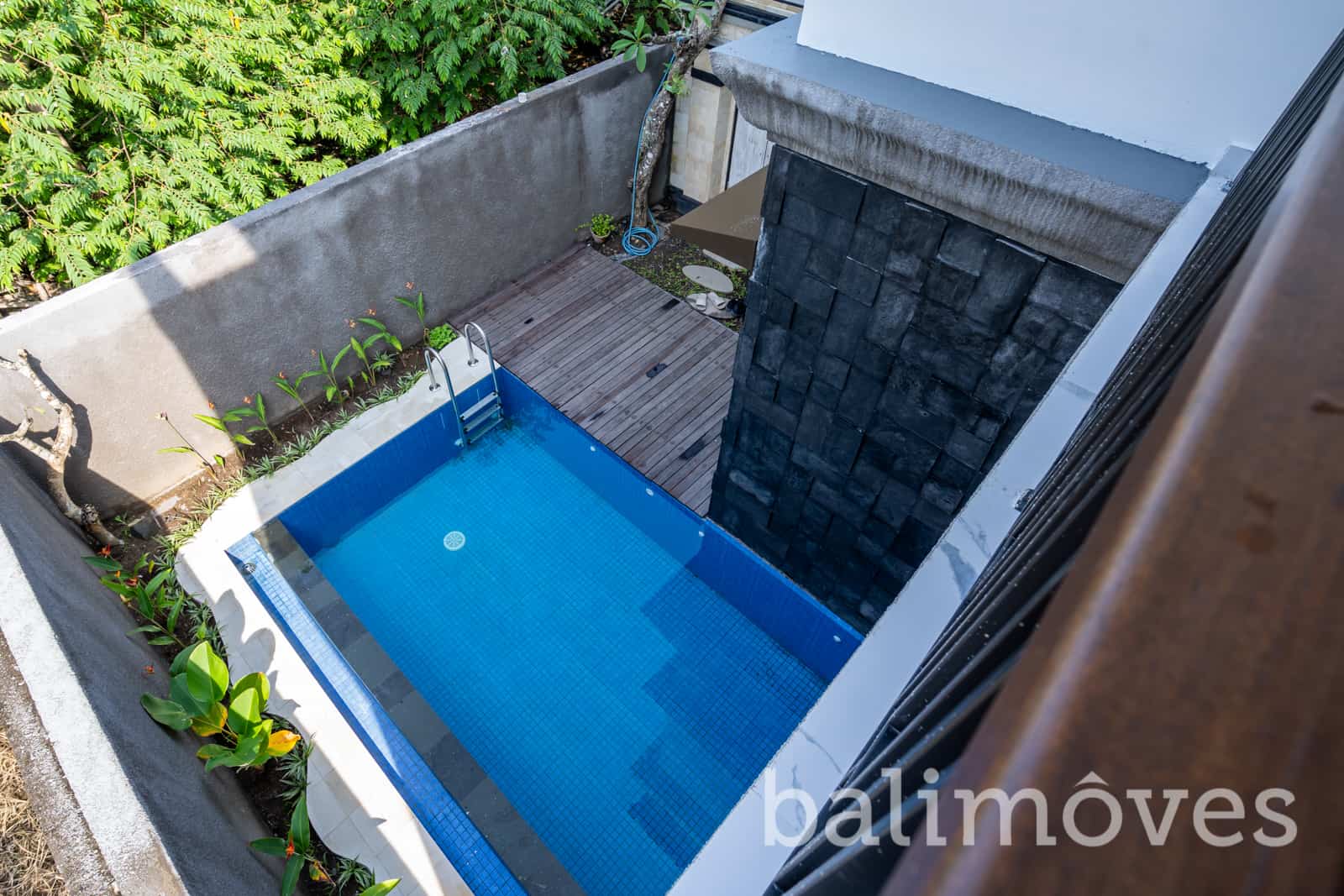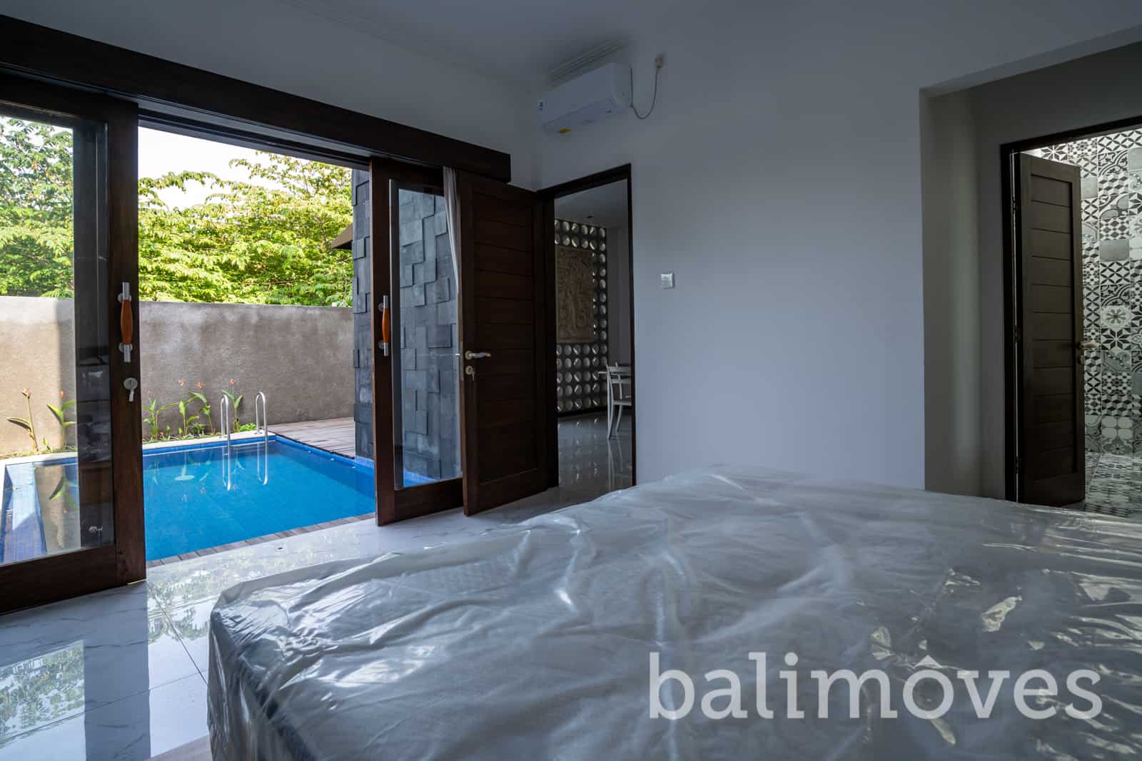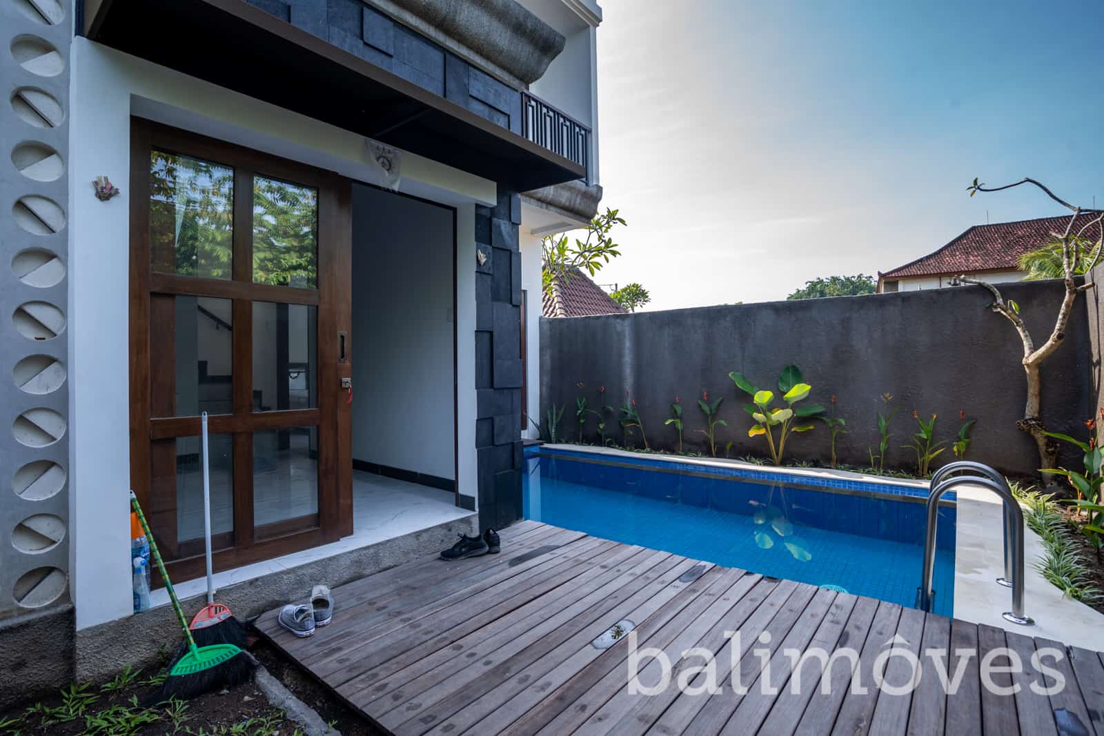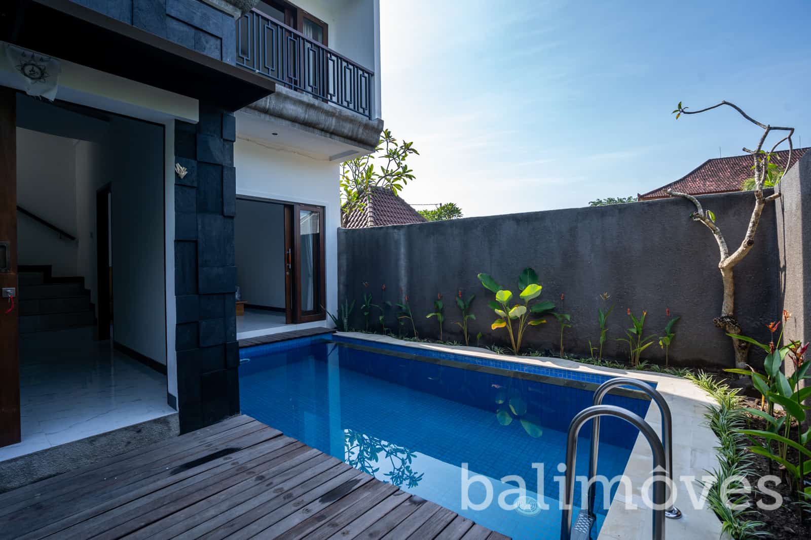 The land area is only 80m2 and equipped with a swimming pool? Yes. This house has a minimalist style. small land is arranged in such a way that it is very effective. This villa is brand new, located in a new villa area on the beachside sanur. 2 bedrooms, 3 bathrooms, equipped with a 5×2,5m swimming pool. Offered furnished included 2 AC, 2 TV, HOB, and fridge.