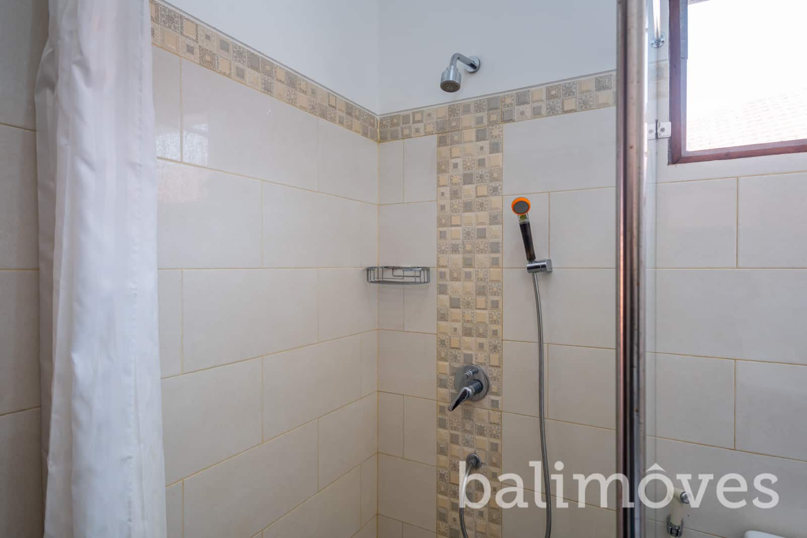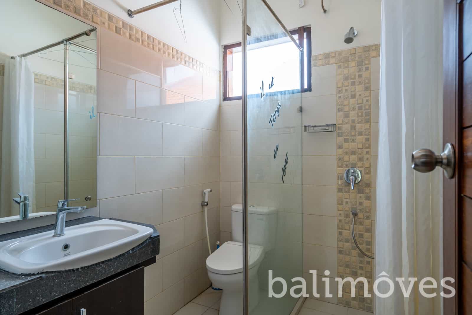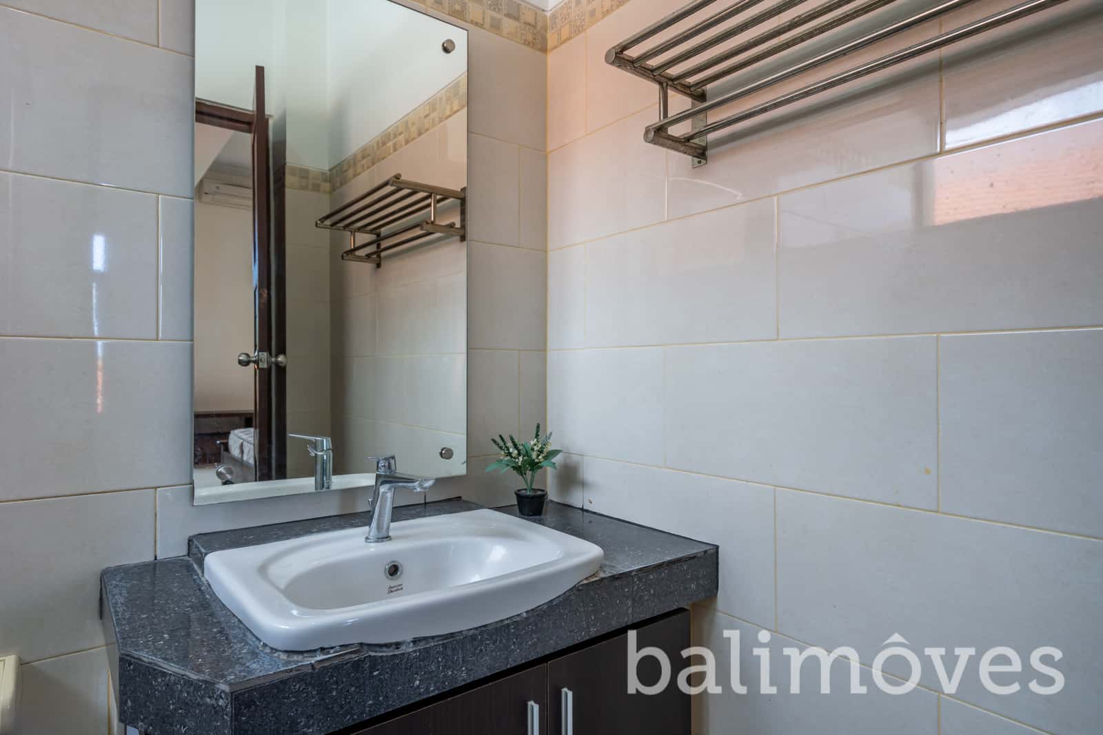 This beautiful property offers 2 stories which consisted of one furnished bedroom on the first level and three bedrooms on the second floor. Yes! all of the rooms come up with an ensuite bathroom fitted with a shower. The first floor of this property offers an enclosed living room equipped with a sofa set and a teakwood table where the LED Tv standing perfectly, there is a dining table that can fit up to 4 people, a modern kitchen set comes up with HOB and fridge, storage, maid room with bathroom yup! this is perfect for you who have a live-in maid, one washing machine, as you can see on the video above this villa have a large swimming pool, the garden is not too big but for you who have a puppy I think the space will still enough, on the second floor there is a balcony that you can use as another space to relaxing with your loved oned.