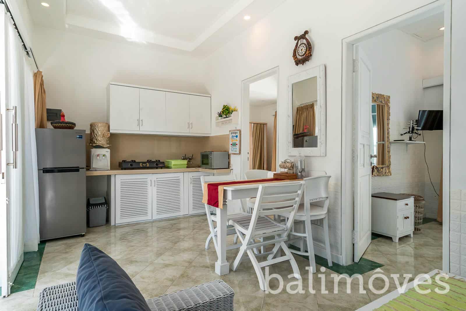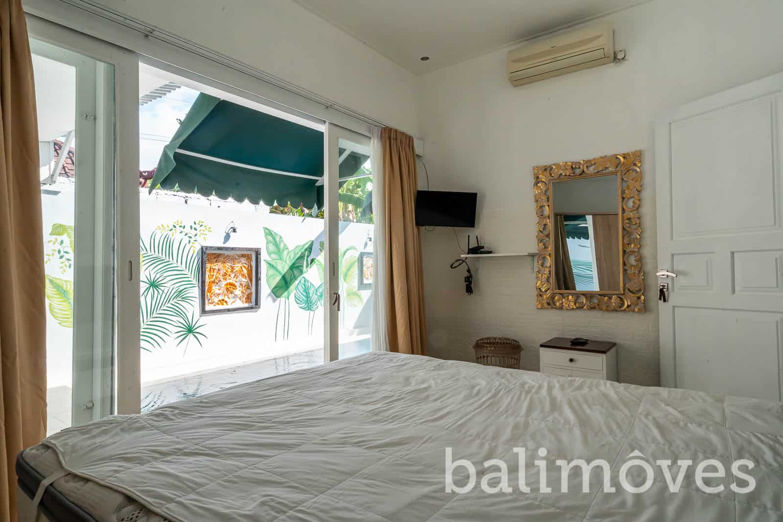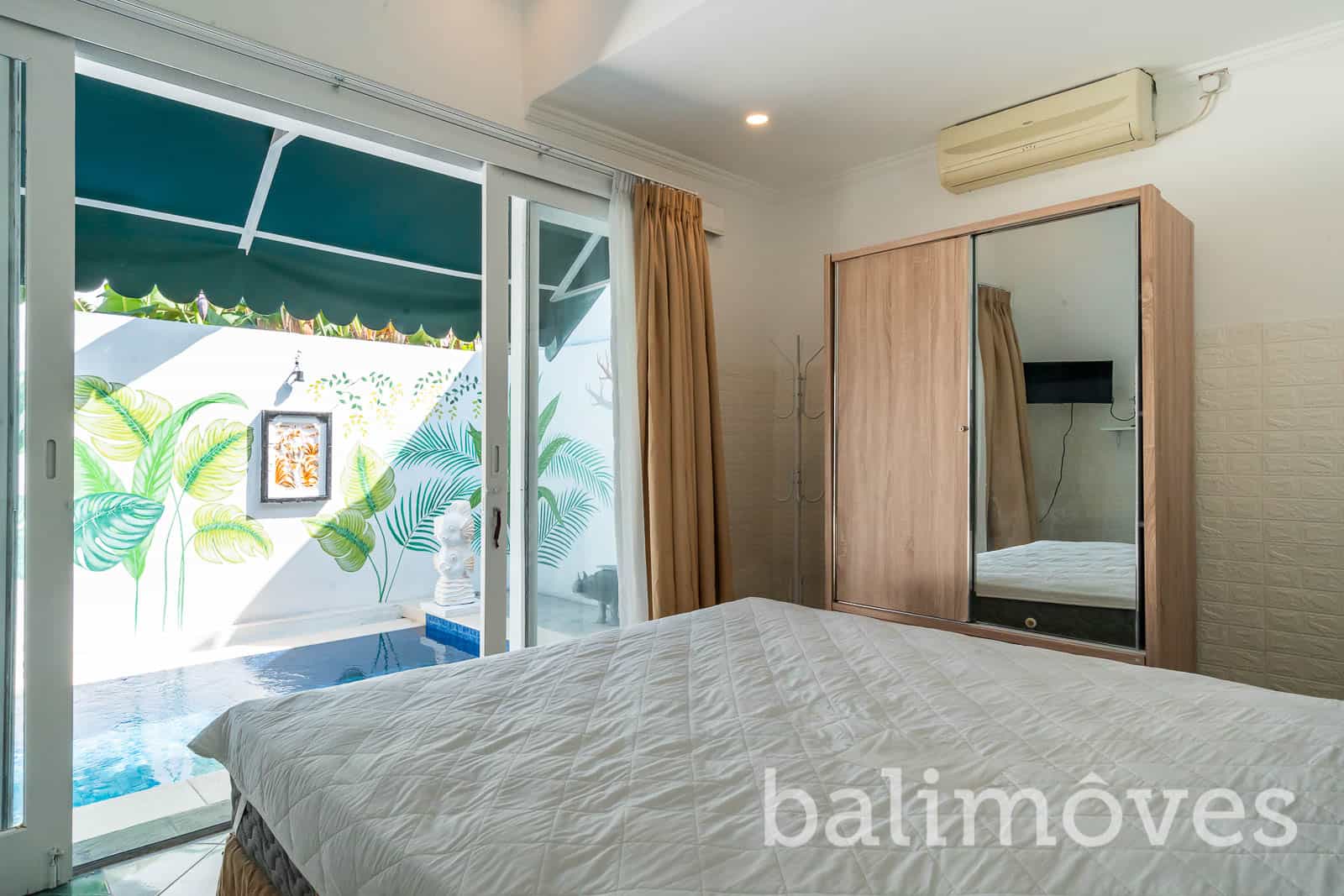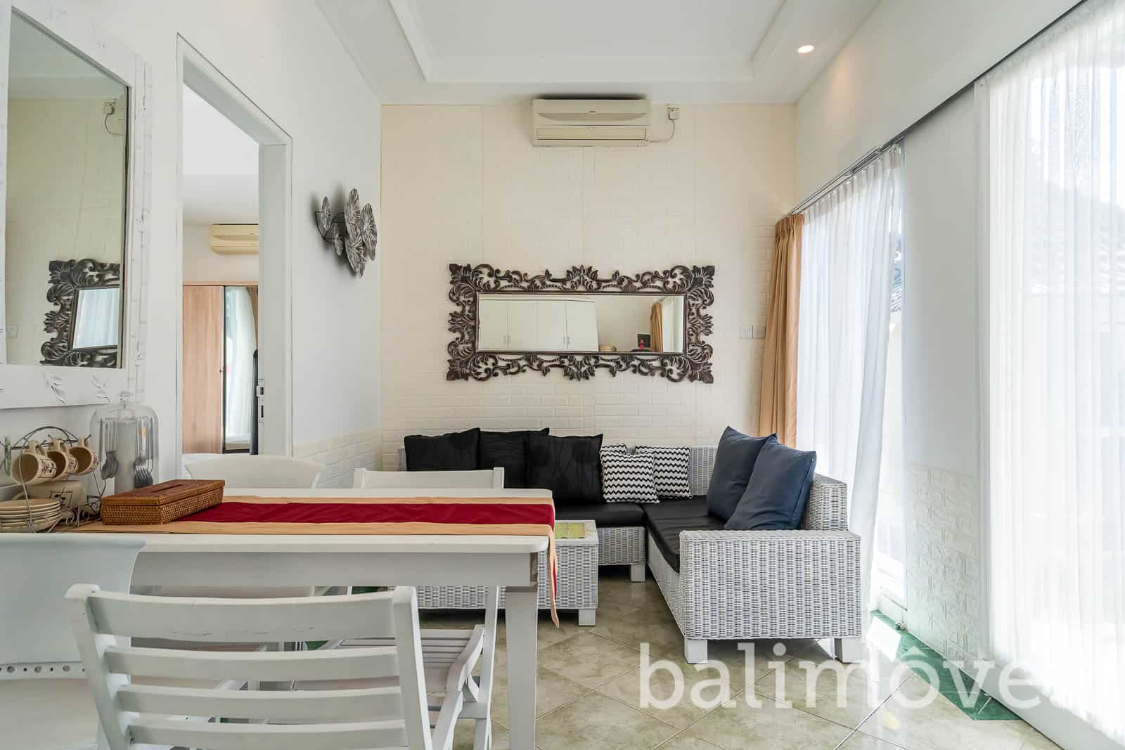 So this villa is actually just finished renovated and the owner is a creative person we can see what he done on his property the way he decorated from matching all the furnitures until the painting. Since the owner taking a very good care on this villa so of course the property is becoming very clean, fresh and alive. The property has a minimalist living designed concept sits on the 150 m2 land & 120 m2 bulding it is consits of two cozy bedroom with ensuited bath and pool view, the closed living is equipped with air conditioner its also located separately with the kitchen and dining area. The villa offer fully furnished with: