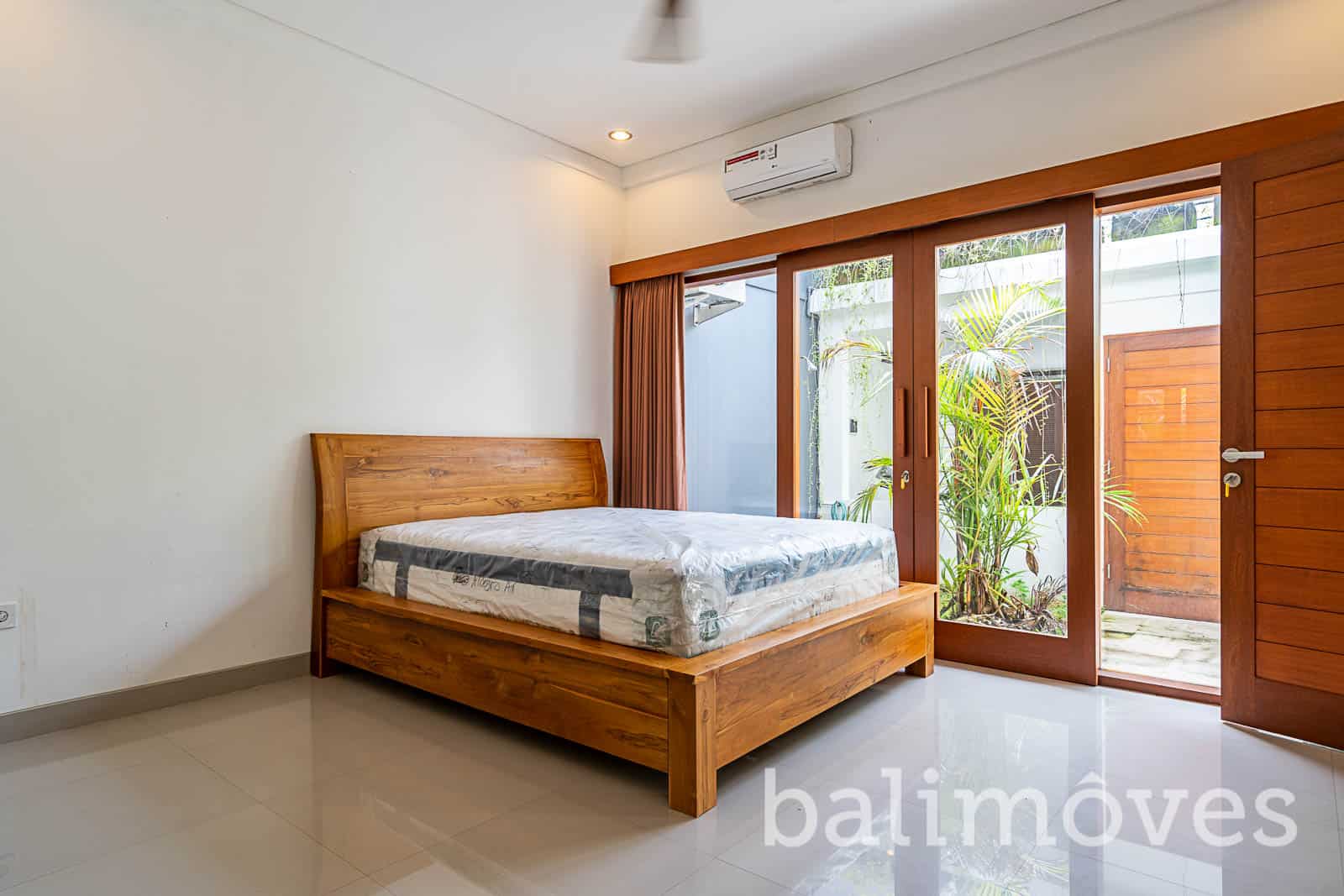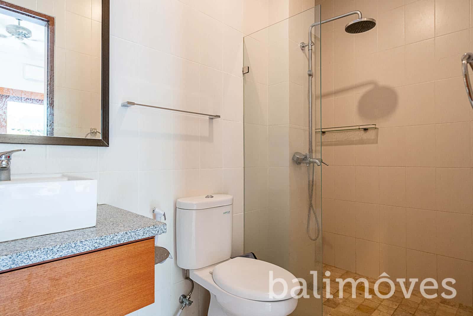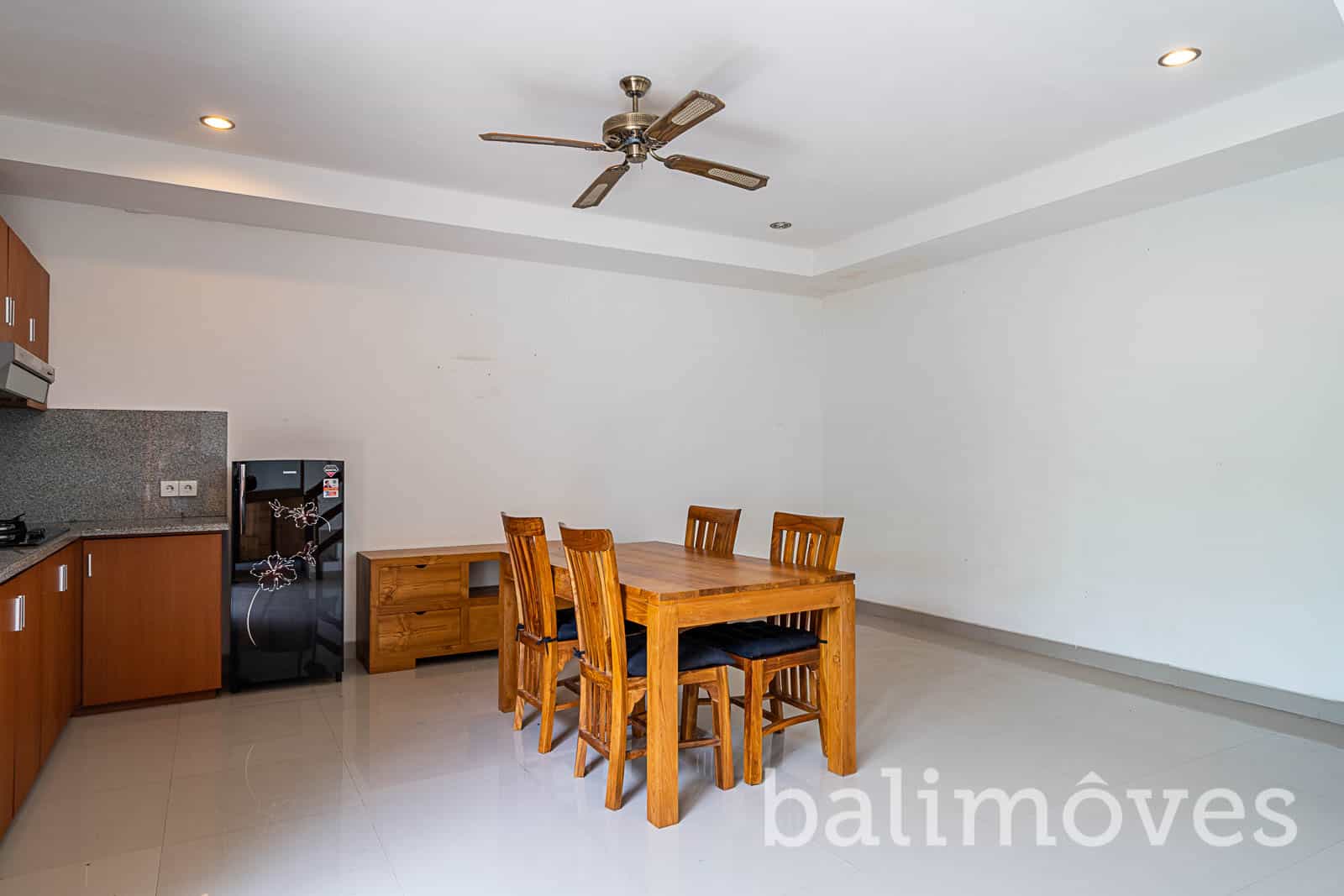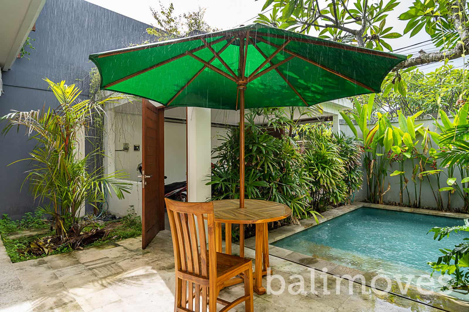 A beautiful minimalist villa was built in 2011 on the 150m2 land and 150m2 the total size of the building, this villa has offered two-level that consisted of one furnished cozy bedroom on the first level and two bright bedrooms on the second floor with balcony access, all the rooms will come up with an ensuite bathroom fitted with shower on each, a closed living room fitted with an AC and one ceiling fan, a fully fitted modern kitchen set that comes up with HOB and fridge, a dining area that could fit up to 4 people, a guest toilet under the stairs on the first level, a washing machine, storage, the outdoor space is actually not spacious as you can see on the photos and video above but it has a cozy space with a nice patio umbrella so you can still have a relaxing day by chilling next to the pool with cold beers on a shiny day with your loved ones, and finally the last but not least there is a garage on this property that can fit up to 1 car and several bikes.