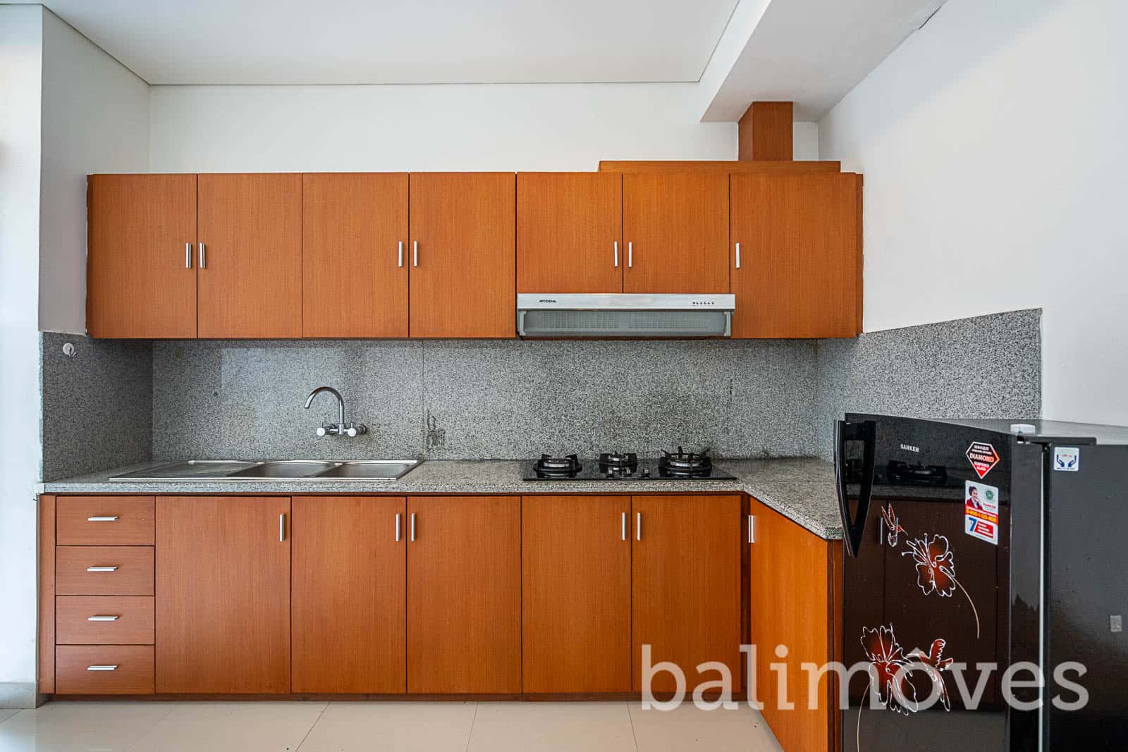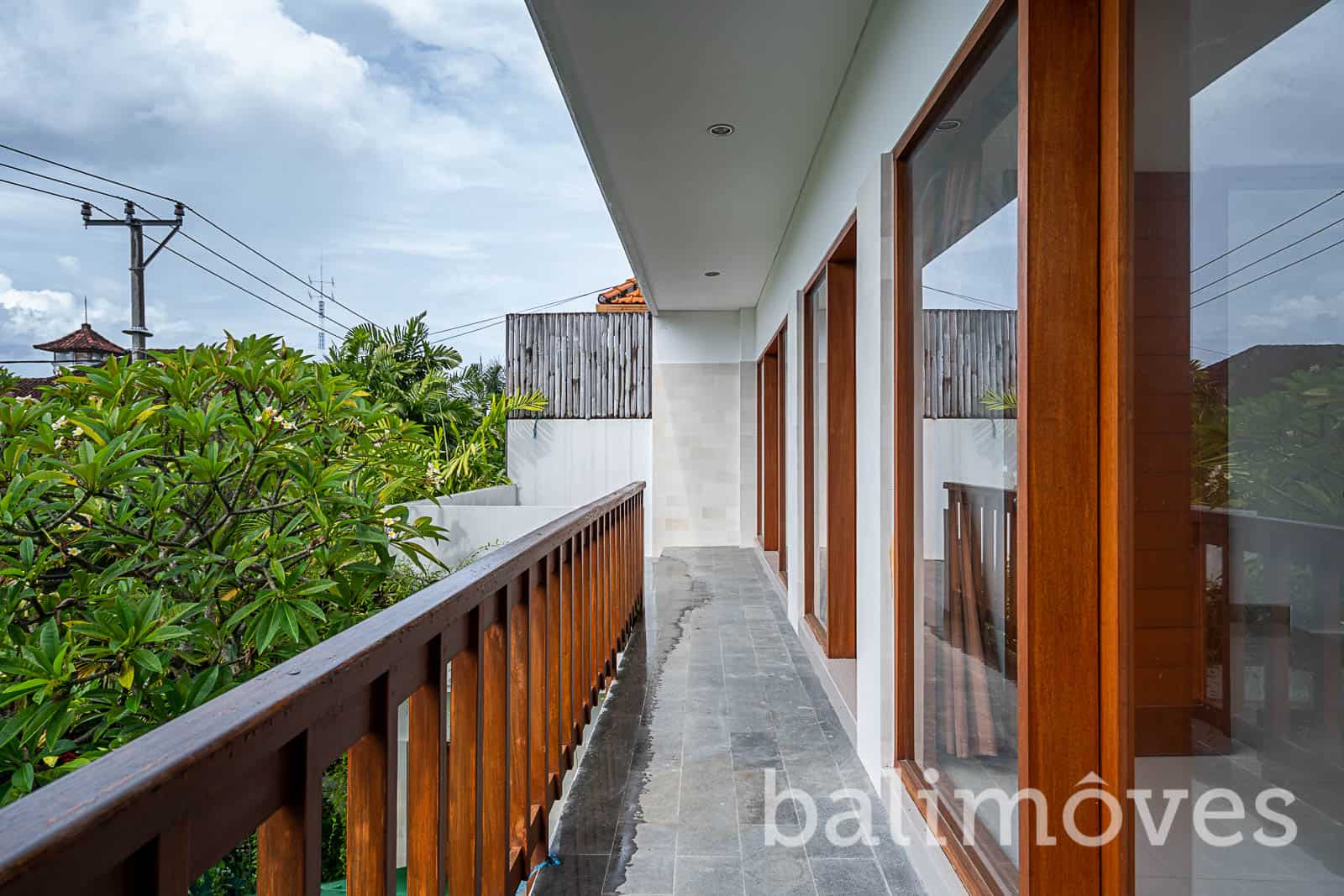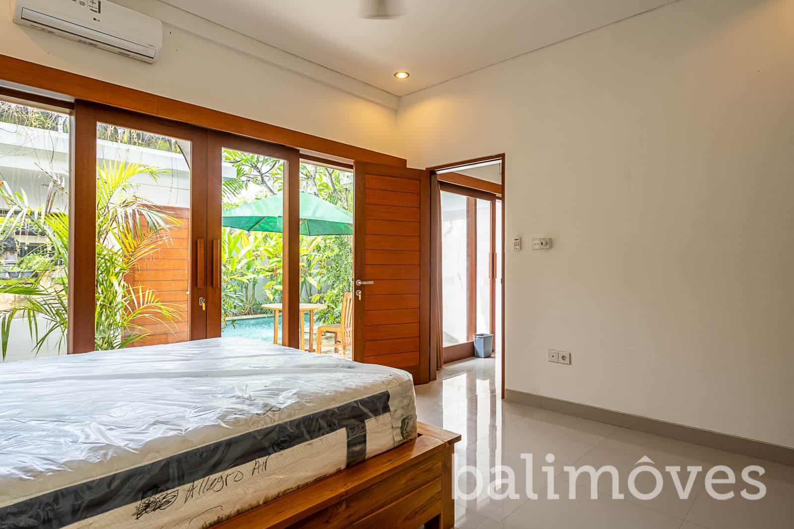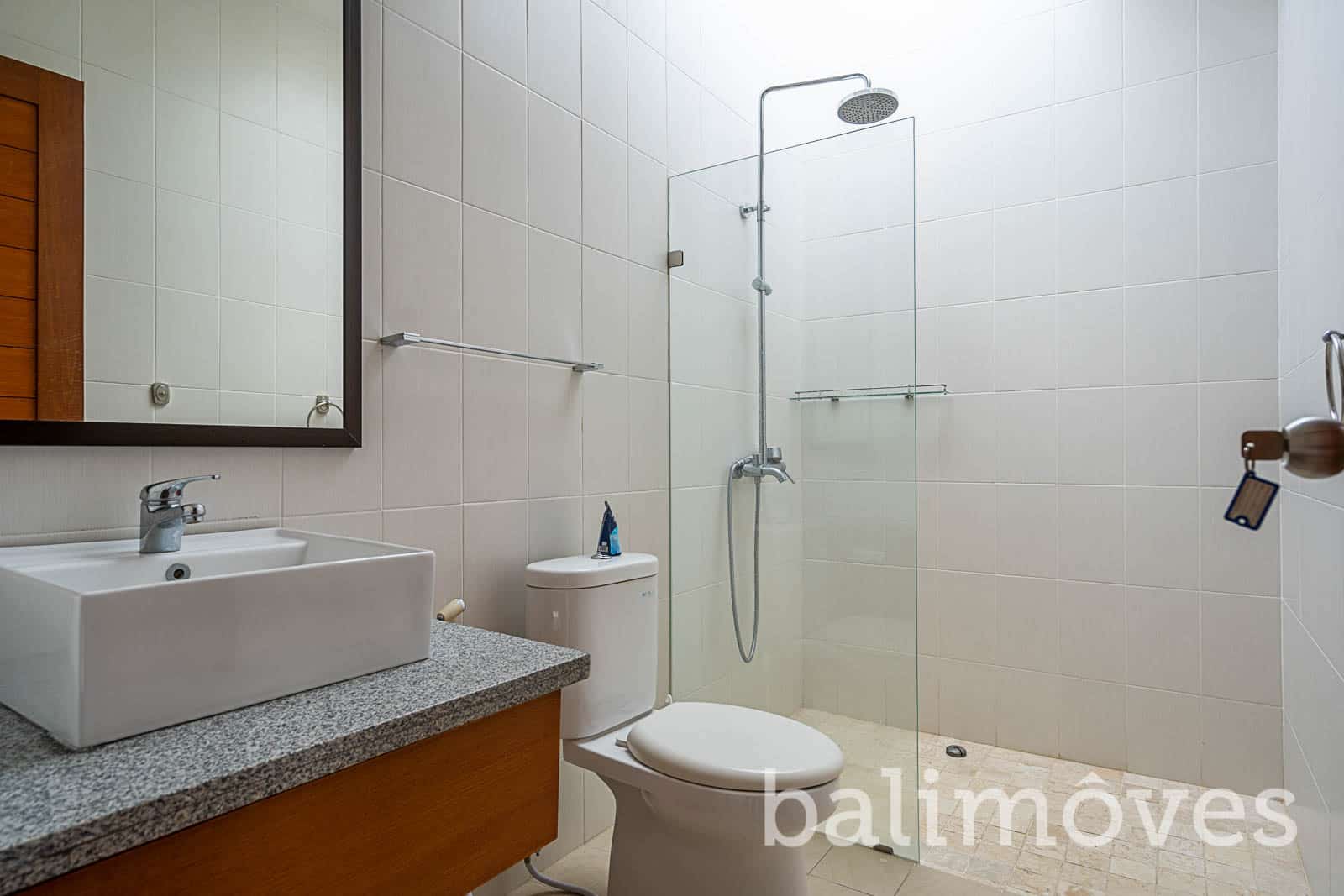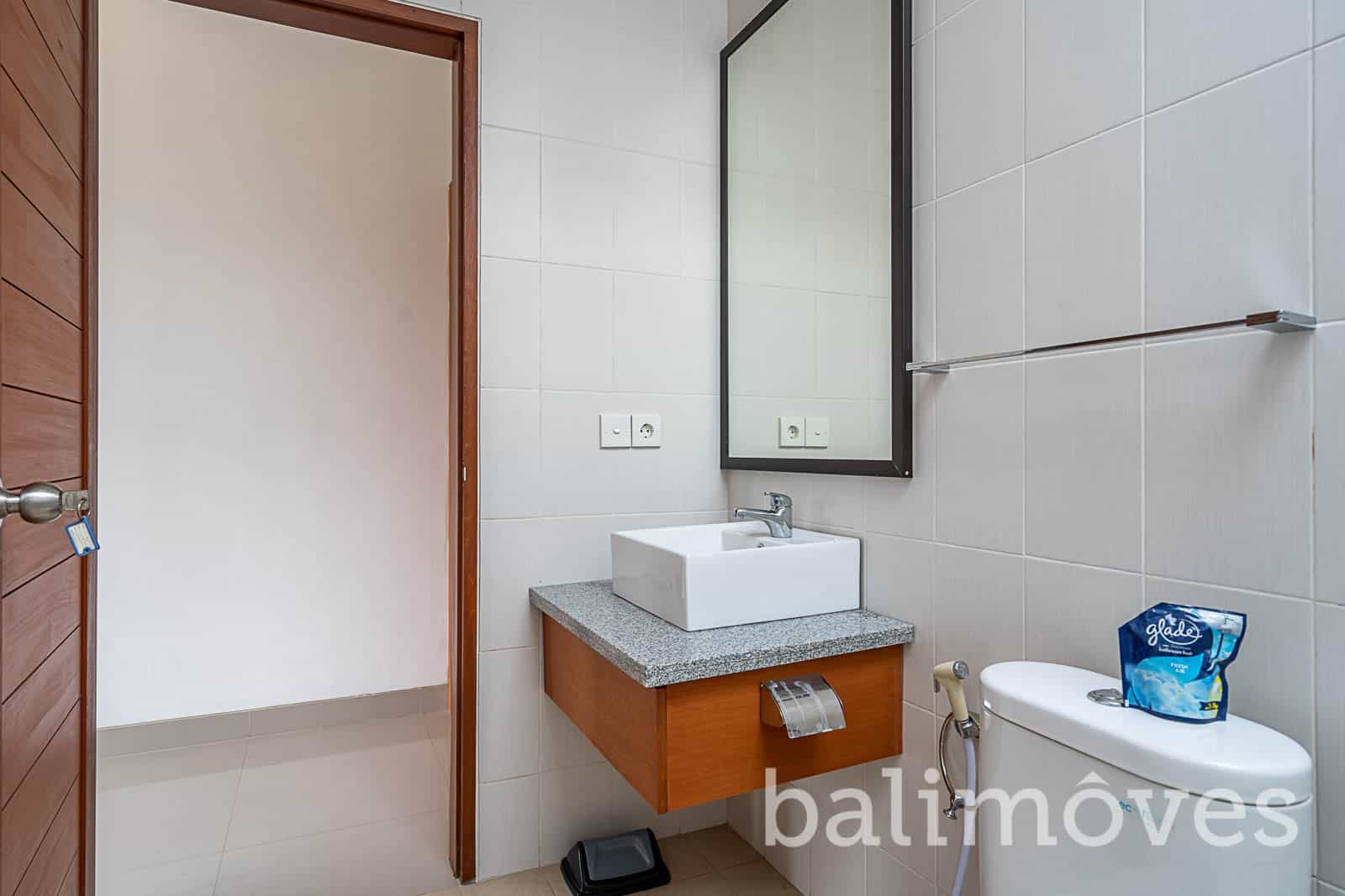 A beautiful minimalist villa was built in 2011 on the 150m2 land and 150m2 the total size of the building, this villa has offered two-level that consisted of one furnished cozy bedroom on the first level and two bright bedrooms on the second floor with balcony access, all the rooms will come up with an ensuite bathroom fitted with shower on each, a closed living room fitted with an AC and one ceiling fan, a fully fitted modern kitchen set that comes up with HOB and fridge, a dining area that could fit up to 4 people, a guest toilet under the stairs on the first level, a washing machine, storage, the outdoor space is actually not spacious as you can see on the photos and video above but it has a cozy space with a nice patio umbrella so you can still have a relaxing day by chilling next to the pool with cold beers on a shiny day with your loved ones, and finally the last but not least there is a garage on this property that can fit up to 1 car and several bikes.