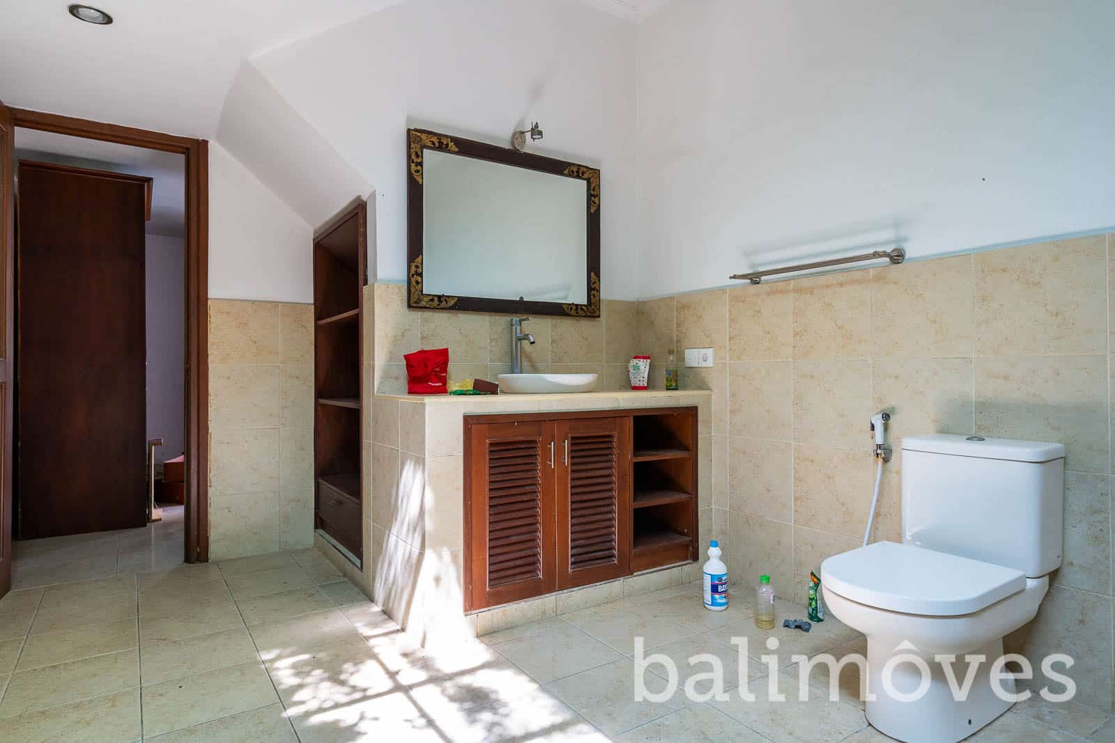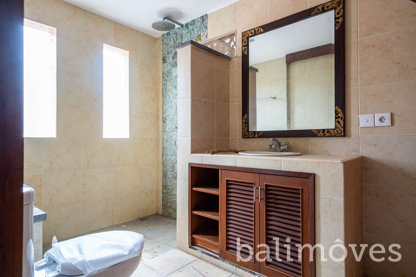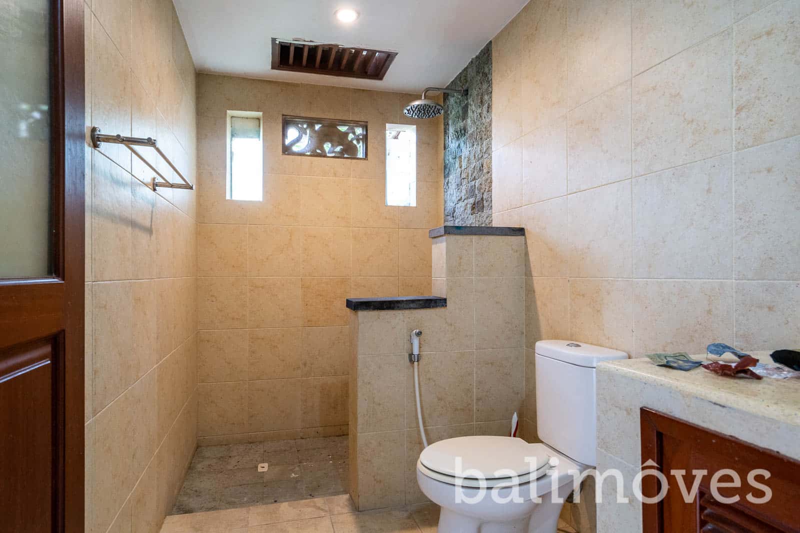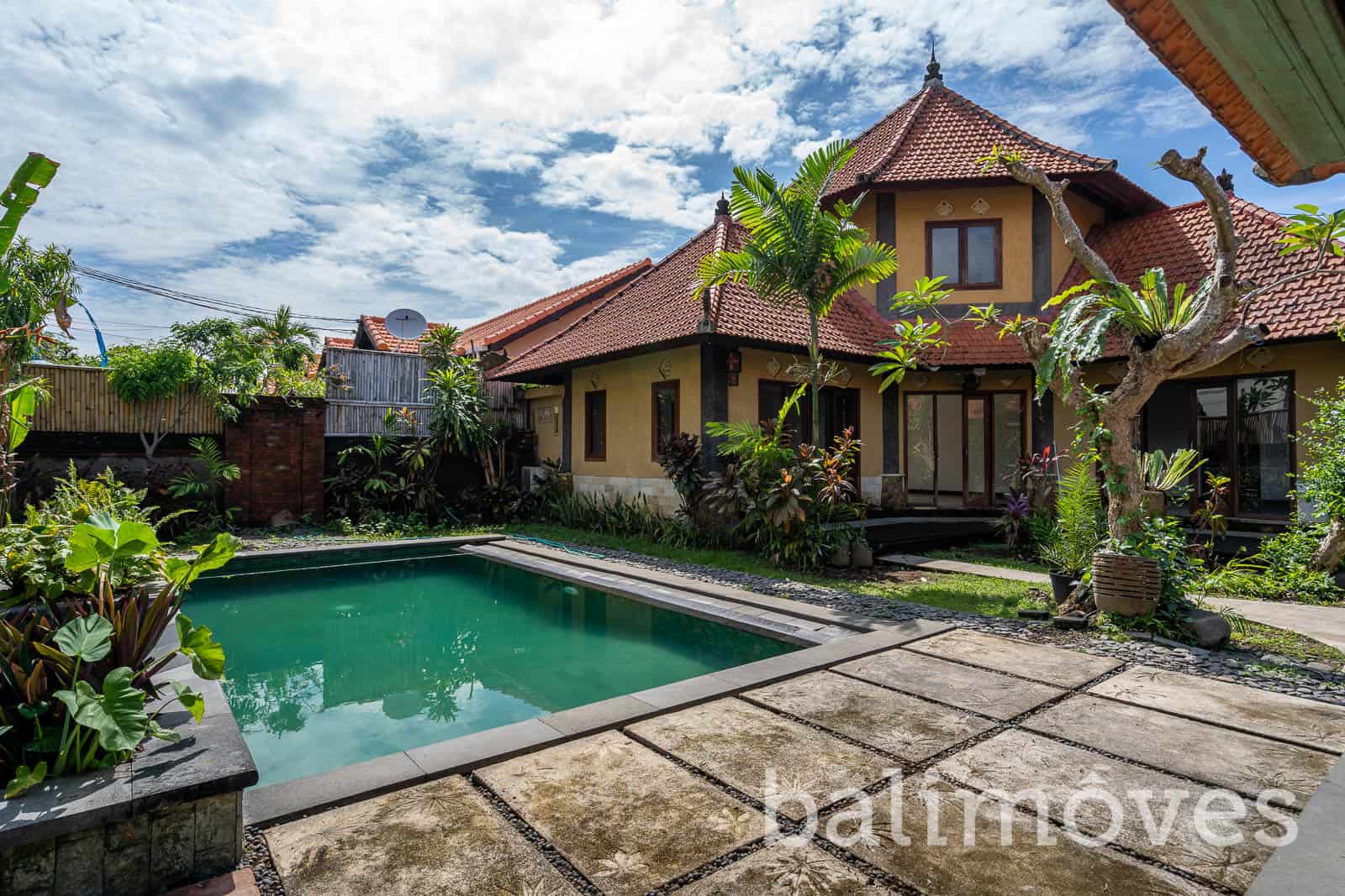 The beautiful villa sits on the spacious land which is 500m2 and the total building size is 250m2 it was built in 2005, yes this property is 16 years old, I think that’s old enough to do some reparation to keep the property nice, and fresh for the next couple years. It has consisted of two-level with one bedroom on the second floor with an ensuite bathroom fitted with a shower and two-bedroom on the first level with an ensuite bathroom each which one fitted with a shower and another one fitted with a bathtub and a rain shower, the closed living room has a full glasses of doors and windows which as you can see on the pictures and video makes the space bright on the day time, good lighting, and good air circulation what else do you need? 🙂 the kitchen of this property is separated from the main building but it has a fully fitted modern kitchen set come up with HOB there is a minimalist terrace that you can use as a dining area, this villa is also come up with a maid room with the bathroom it is located just next to the kitchen so if you have a live-in maid or are planning to get one this place might suit you, it is offered unfurnished so yes! you will need to fill this property up with your own furniture and your own decoration. Since the building size is just half of the total land, of course, this villa has a spacious yard and a good size of swimming pool. For you who love planting, you can consider this beauty as an option.