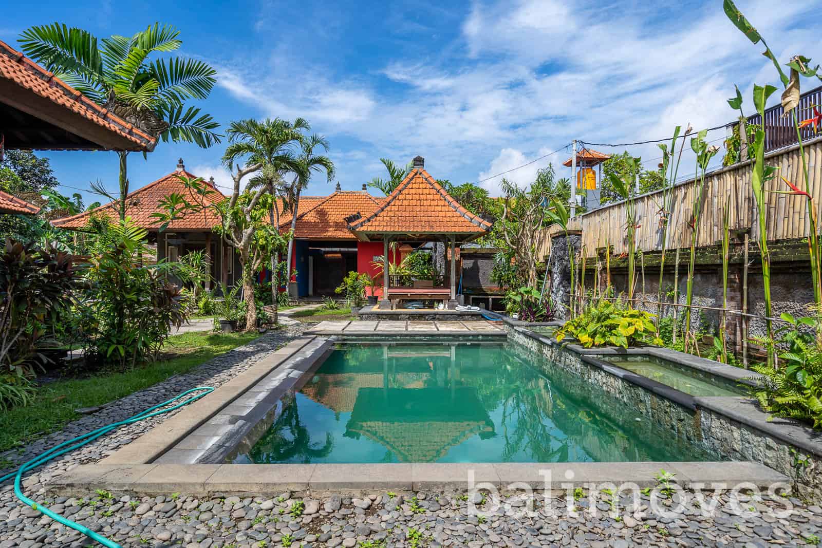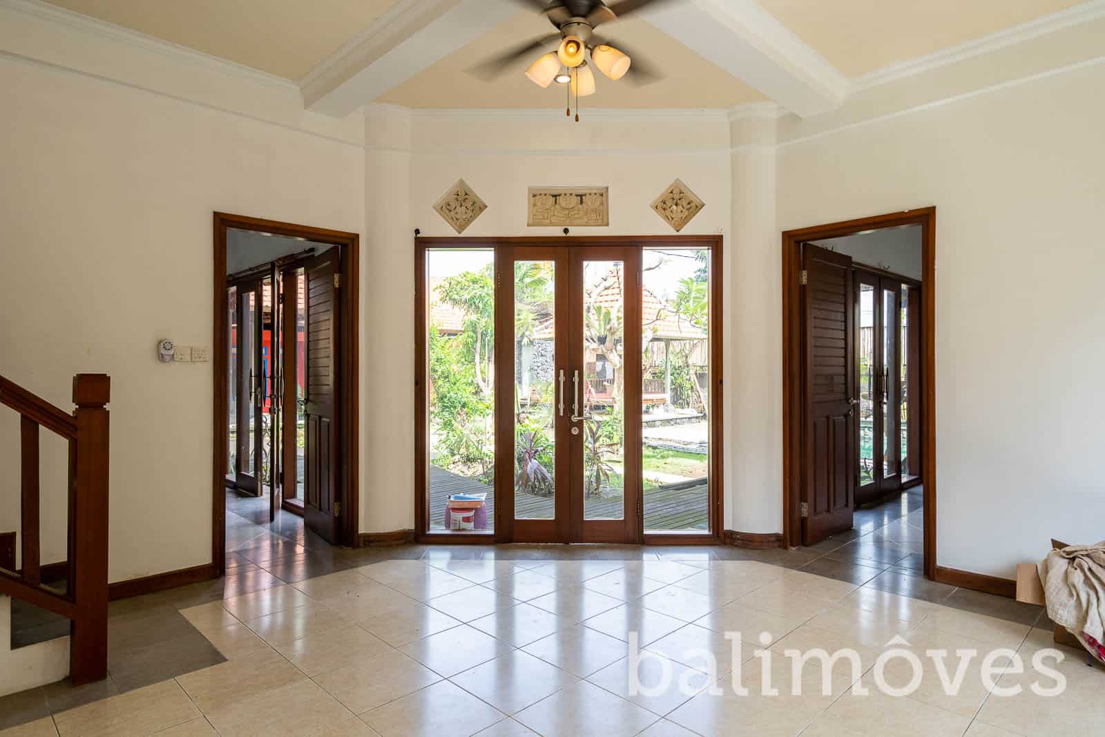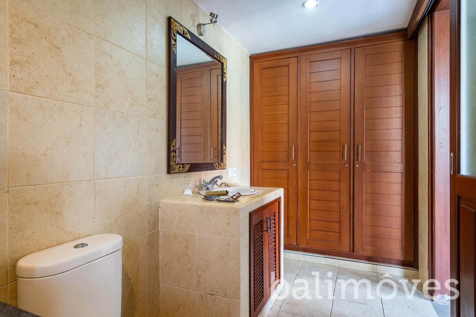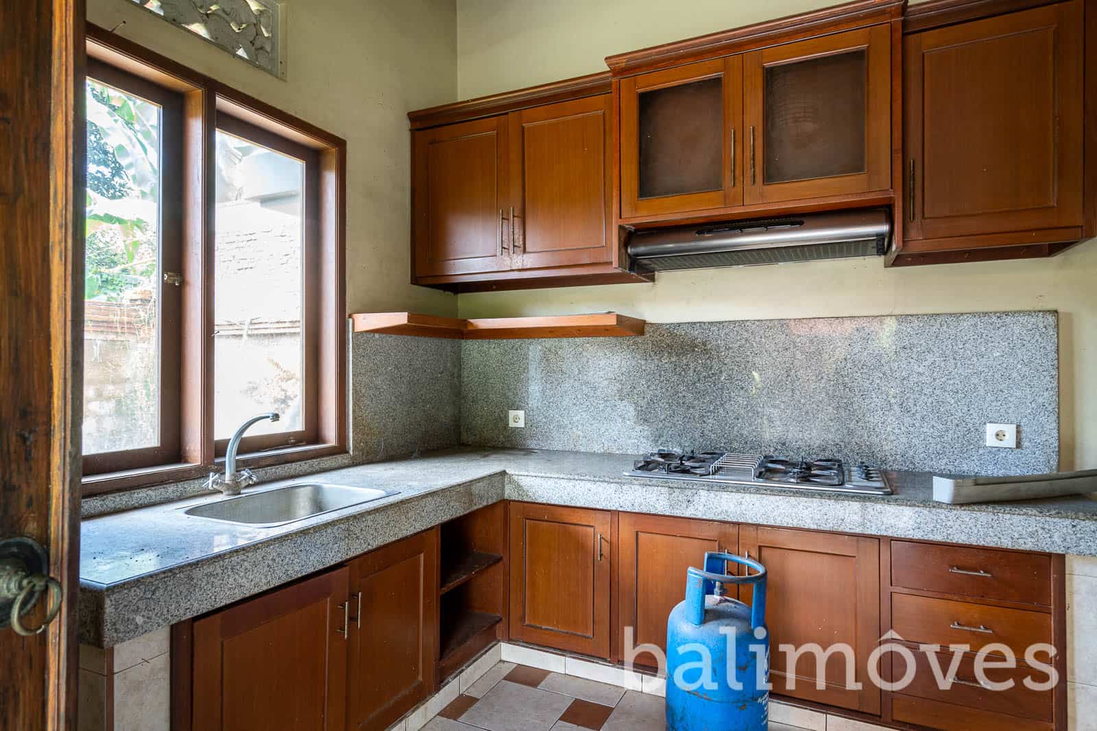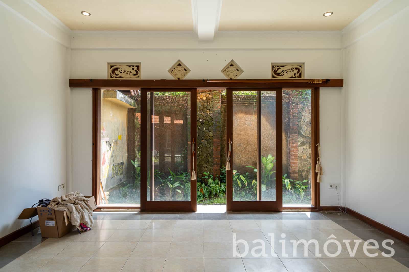 The beautiful villa sits on the spacious land which is 500m2 and the total building size is 250m2 it was built in 2005, yes this property is 16 years old, I think that’s old enough to do some reparation to keep the property nice, and fresh for the next couple years. It has consisted of two-level with one bedroom on the second floor with an ensuite bathroom fitted with a shower and two-bedroom on the first level with an ensuite bathroom each which one fitted with a shower and another one fitted with a bathtub and a rain shower, the closed living room has a full glasses of doors and windows which as you can see on the pictures and video makes the space bright on the day time, good lighting, and good air circulation what else do you need? 🙂 the kitchen of this property is separated from the main building but it has a fully fitted modern kitchen set come up with HOB there is a minimalist terrace that you can use as a dining area, this villa is also come up with a maid room with the bathroom it is located just next to the kitchen so if you have a live-in maid or are planning to get one this place might suit you, it is offered unfurnished so yes! you will need to fill this property up with your own furniture and your own decoration. Since the building size is just half of the total land, of course, this villa has a spacious yard and a good size of swimming pool. For you who love planting, you can consider this beauty as an option.