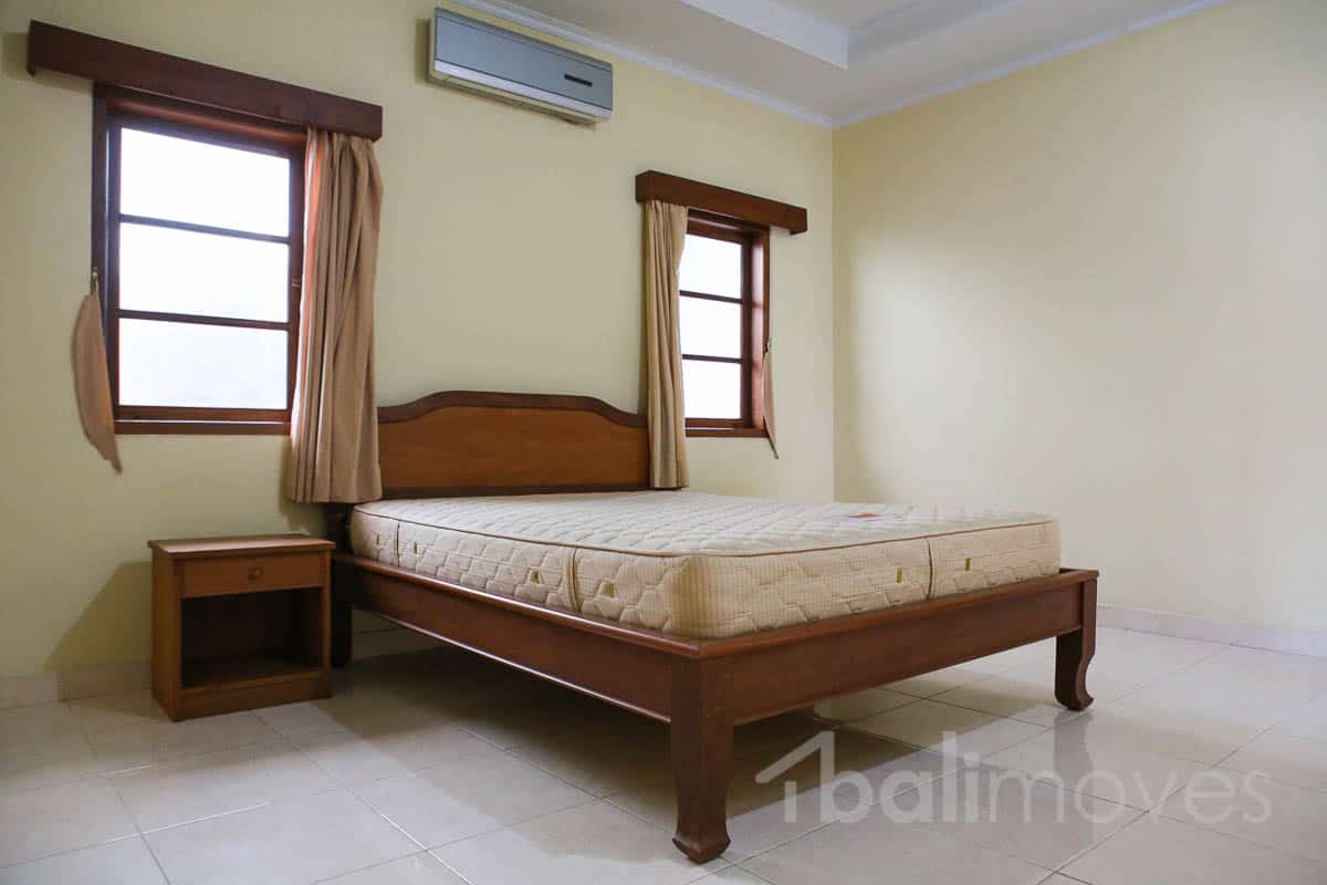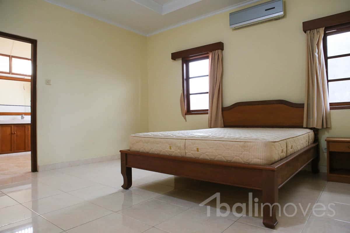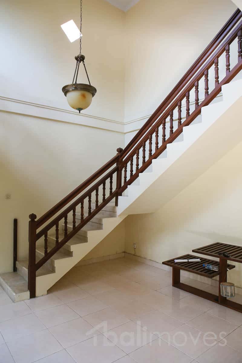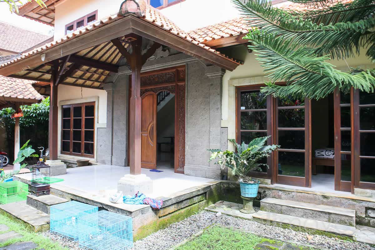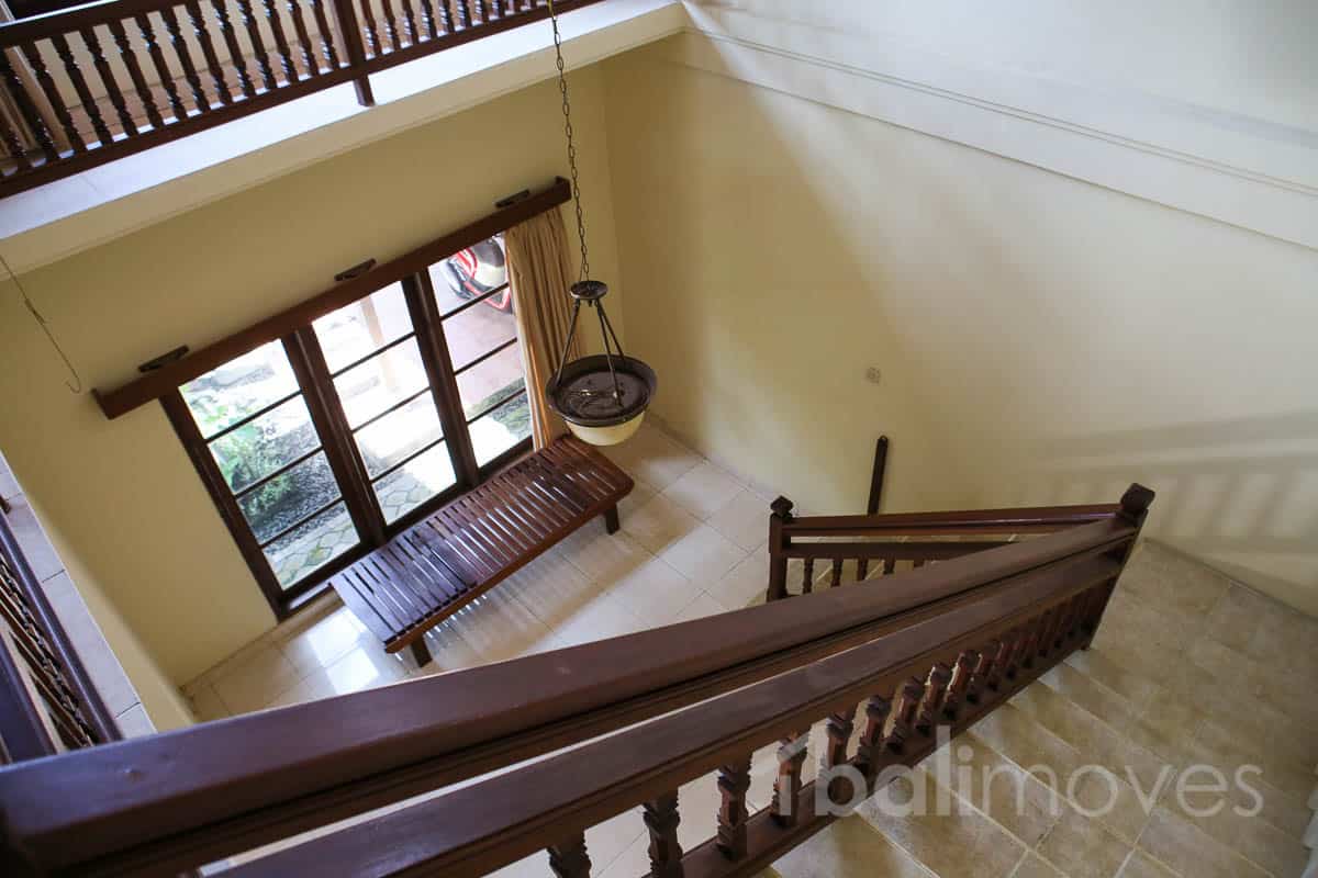 This is a Bali style house located in a popular residential area of western Sanur. It’s on two floors, meaning a bit more space downstairs for a larger living area and kitchen. Three bedrooms (two upstairs) and four bathrooms, closed style, so no sharing with the local wildlife unless you let ’em in yourself. A good useable layout, sometimes lacking in this style of building, but with some interesting architectural touches. Off street parking, no pool, good price, a good overall package.