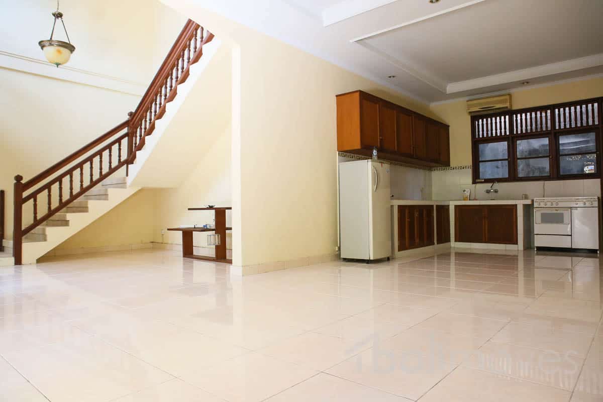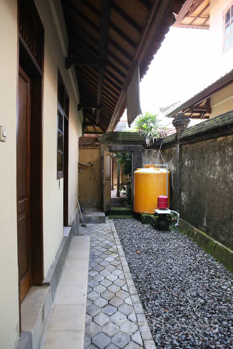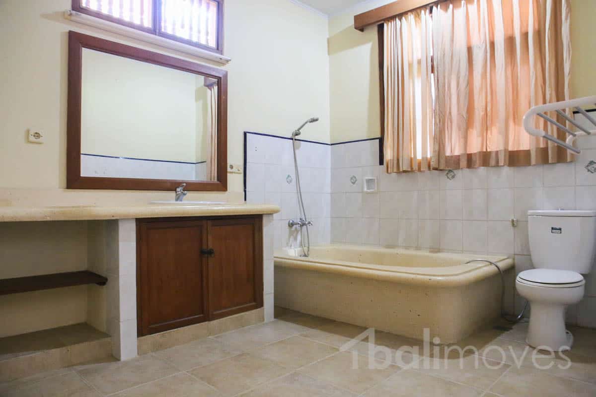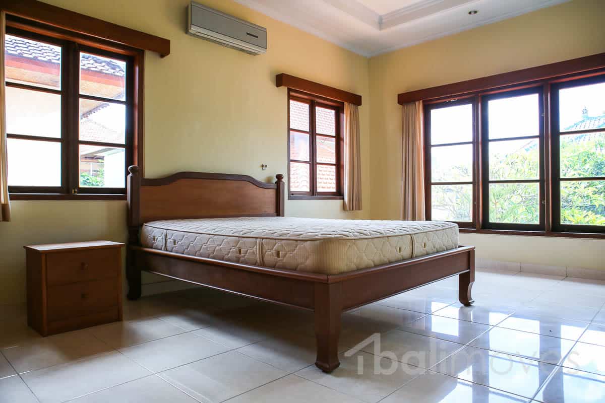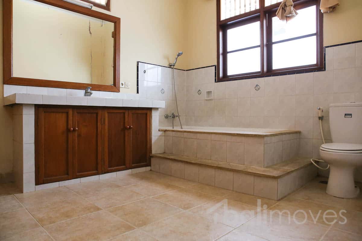 This is a Bali style house located in a popular residential area of western Sanur. It’s on two floors, meaning a bit more space downstairs for a larger living area and kitchen. Three bedrooms (two upstairs) and four bathrooms, closed style, so no sharing with the local wildlife unless you let ’em in yourself. A good useable layout, sometimes lacking in this style of building, but with some interesting architectural touches. Off street parking, no pool, good price, a good overall package.