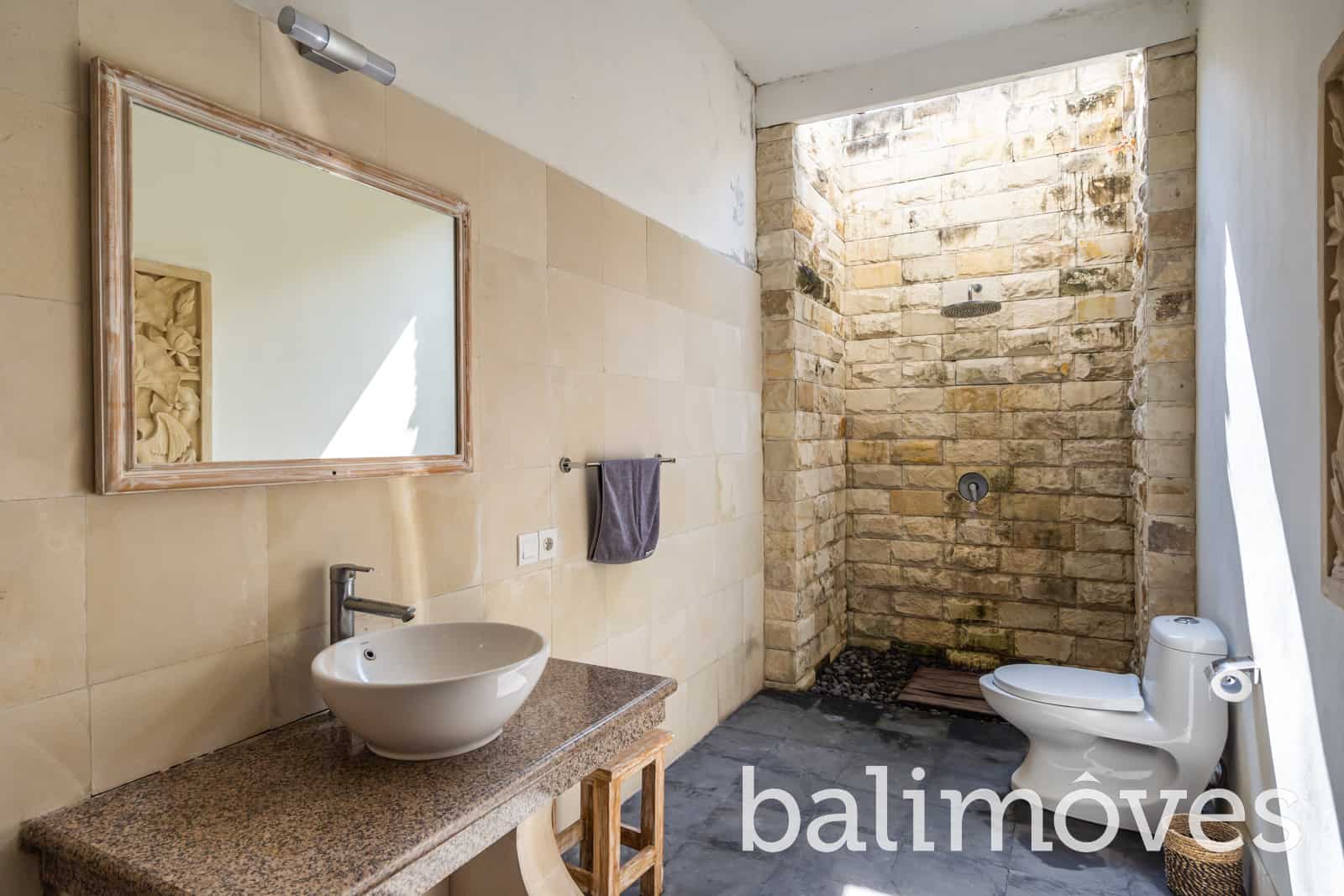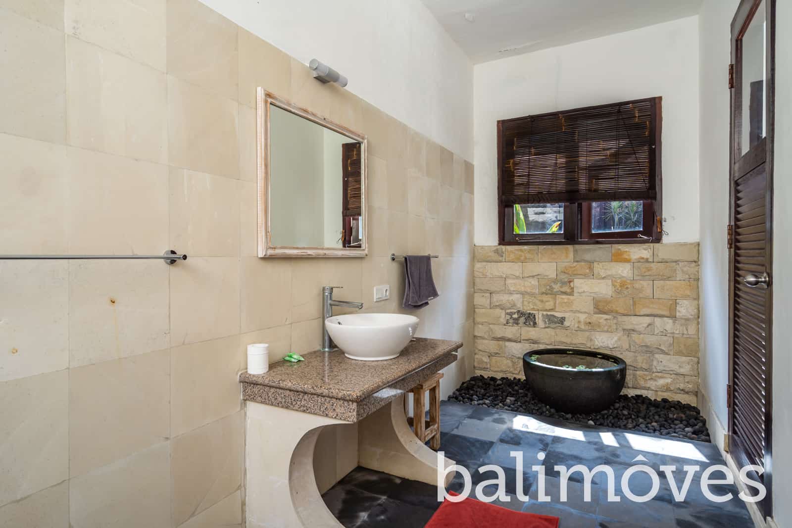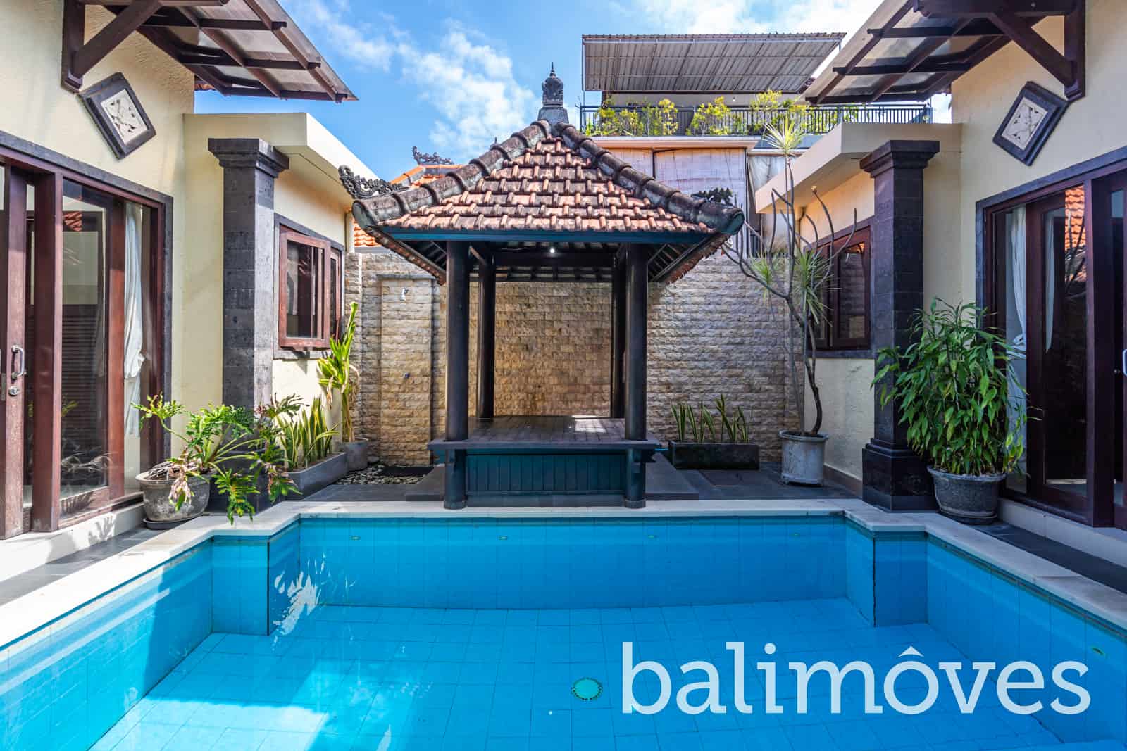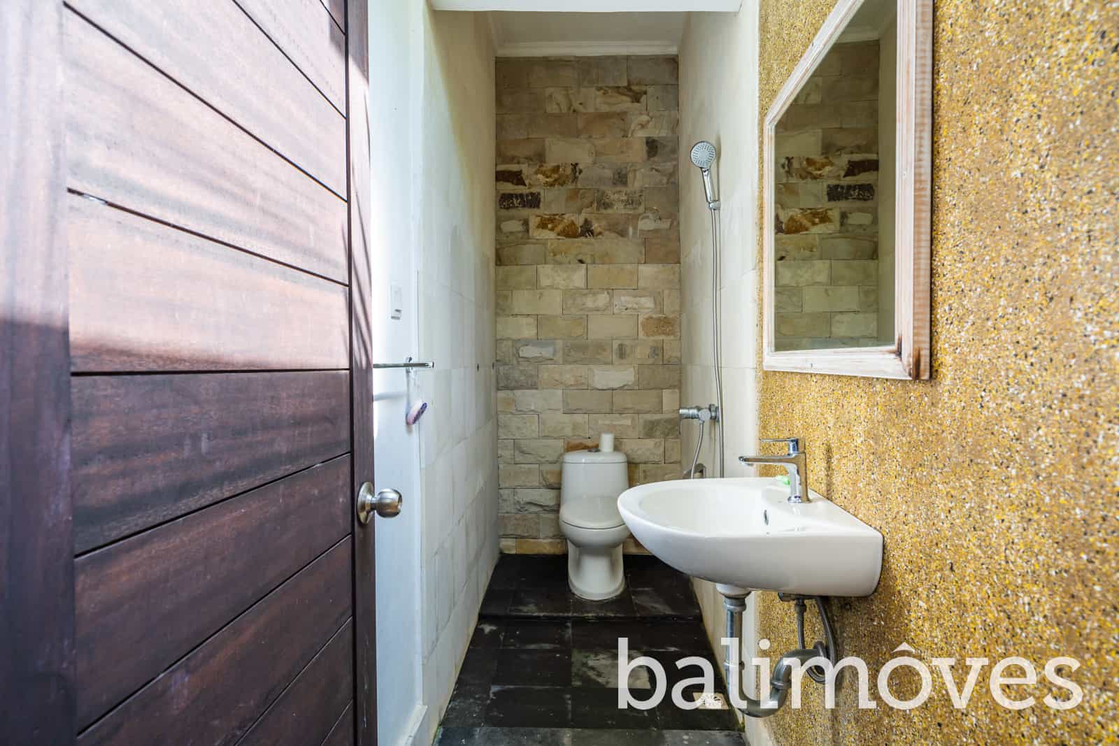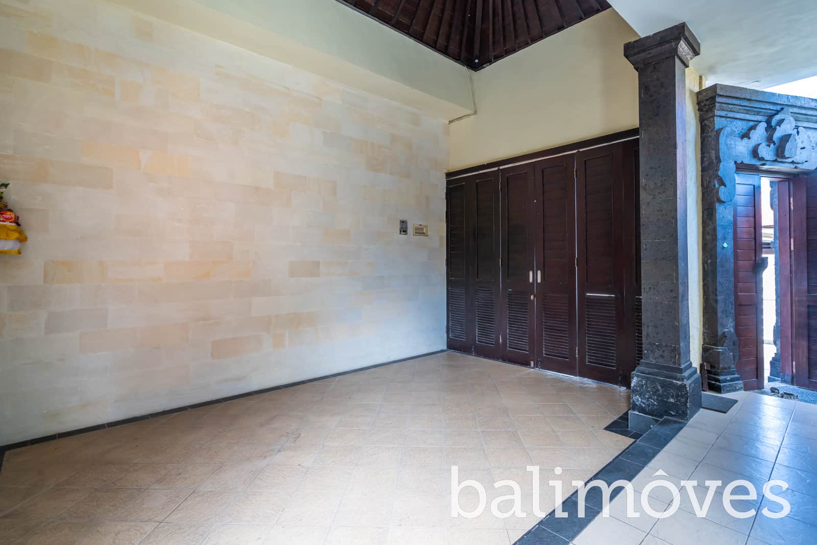 Built without stairs, this house has 3 bedrooms in total, each room is equipped with an en suite bathroom. This house has an open kitchen and living room concept overlooking the swimming pool in the middle of the house. The 5x3m swimming pool is the center of the view from this house, the owner didn’t forget to add a bale bengong on one side of the pool, this is a very cool place to relax. This house is offered for sale and is equipped with TV, Fan, 3 AC, HOB, Fridge, storage, and internet (Indihome).