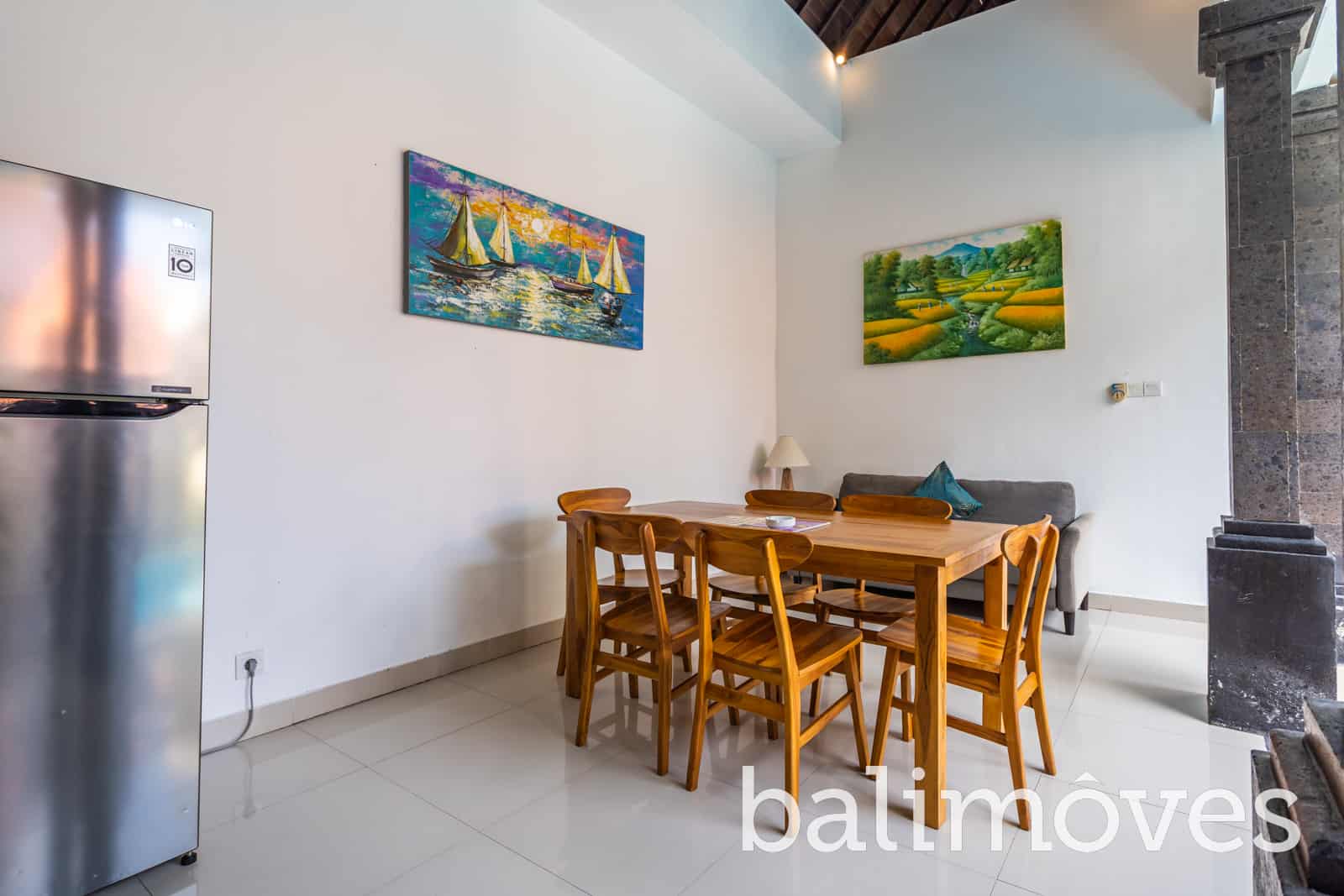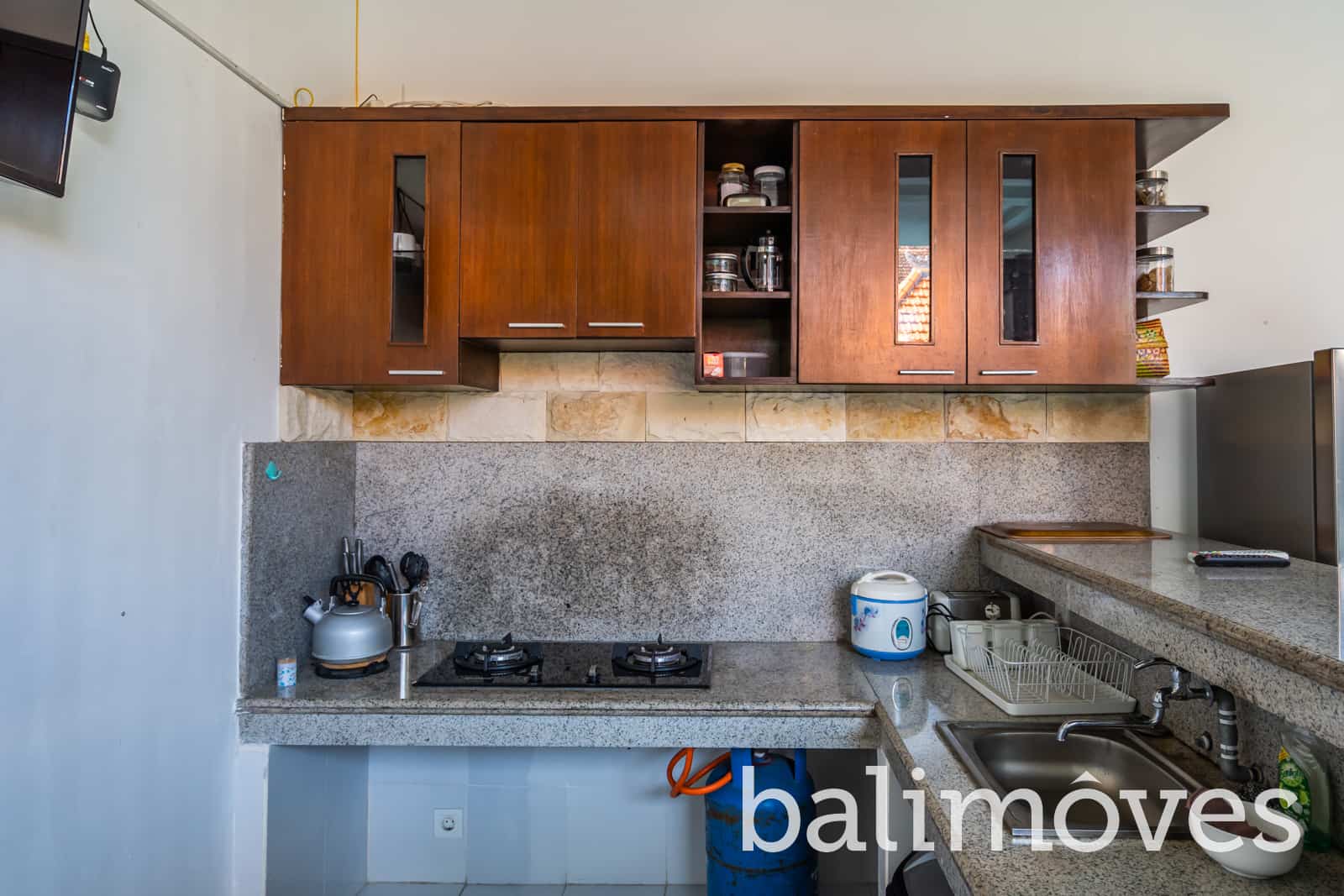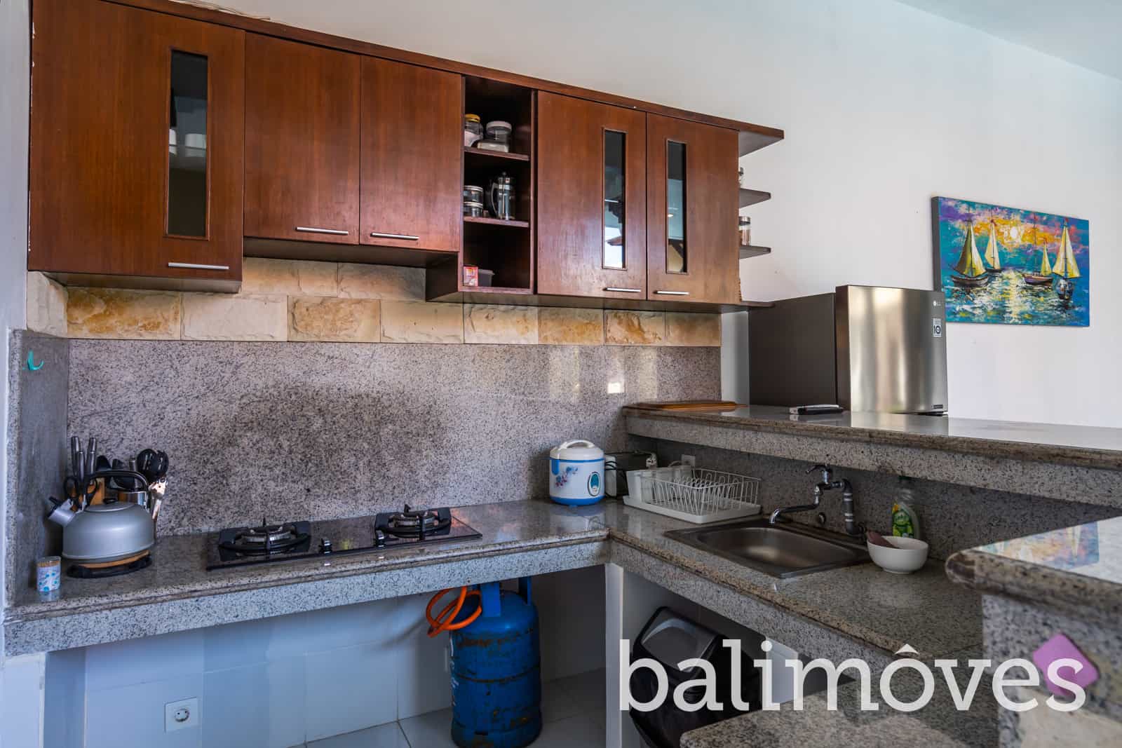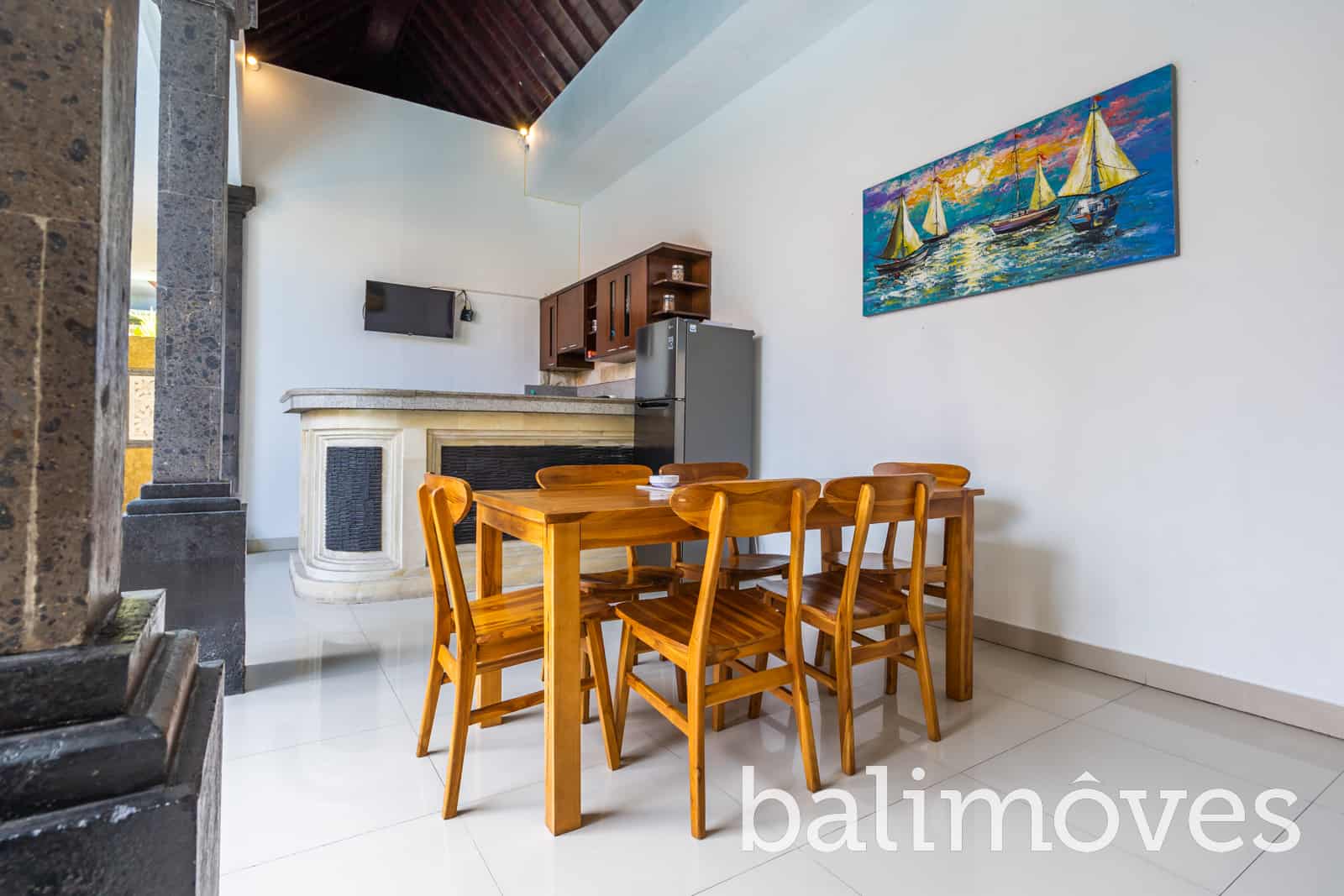 Built without stairs, this house has 3 bedrooms in total, each room is equipped with an en suite bathroom. This house has an open kitchen and living room concept overlooking the swimming pool in the middle of the house. The 5x3m swimming pool is the center of the view from this house, the owner didn’t forget to add a bale bengong on one side of the pool, this is a very cool place to relax. This house is offered for sale and is equipped with TV, Fan, 3 AC, HOB, Fridge, storage, and internet (Indihome).