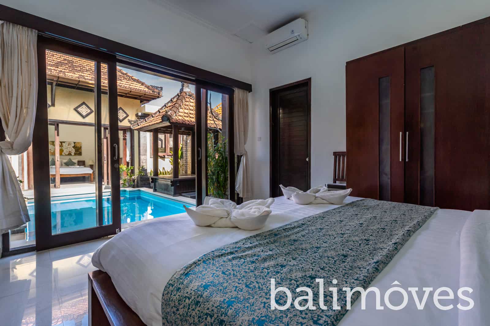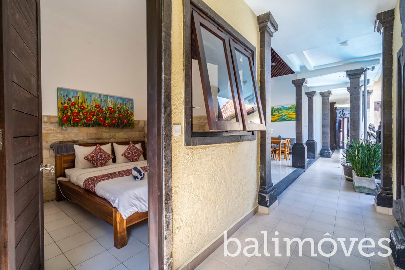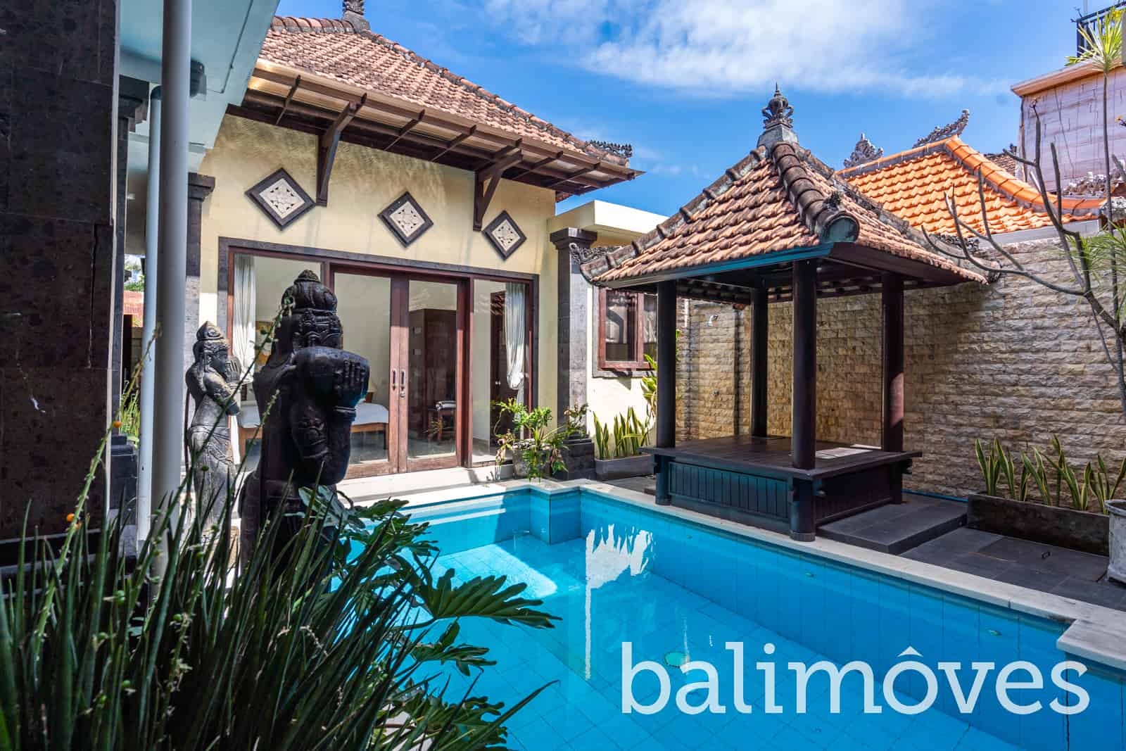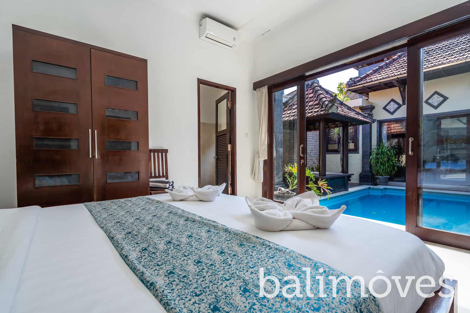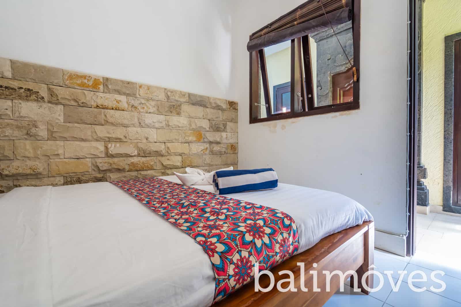Built without stairs, this house has 3 bedrooms in total, each room is equipped with an en suite bathroom. This house has an open kitchen and living room concept overlooking the swimming pool in the middle of the house. The 5x3m swimming pool is the center of the view from this house, the owner didn’t forget to add a bale bengong on one side of the pool, this is a very cool place to relax. This house is offered for sale and is equipped with TV, Fan, 3 AC, HOB, Fridge, storage, and internet (Indihome).