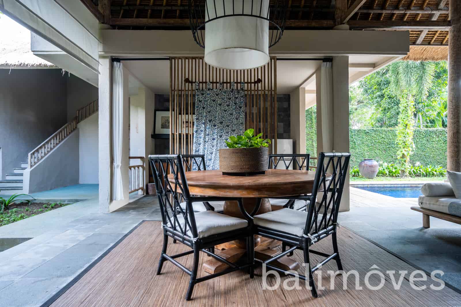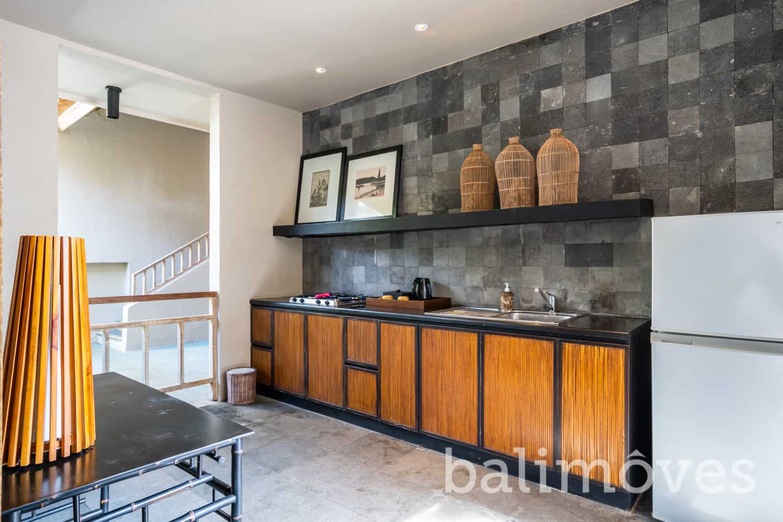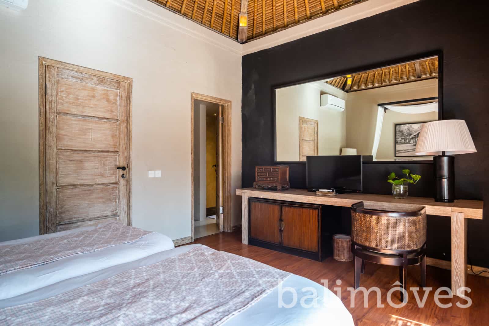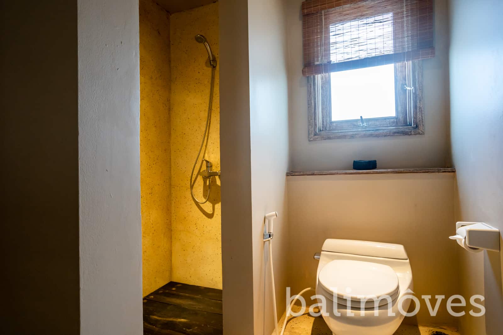 The property was built in 2017 on the 4 are plot land and 2 are building size, this villa has a modern design with an open living concept, coming out with Alang Alang roof (thatched roof). The living area is attached with a cozy couch with a pool view this space is connected as well to the dining area as you can see above, the villa also offers one guest toilet, an open-air minimalist kitchen that coming out with HOB and fridge, one master bedroom which located on the first floor offers furnished with an ensuite bathroom fitted with bathtub and shower, second bedroom located just above the master bedroom, yes! it is located on the second floor, it is bright and offers furnished as well with a twin bed, a big mirror attached on the wall and large size of the teak wooden table that you can use as a working space, it has an ensuite bathroom fitted with shower this room have a private balcony.