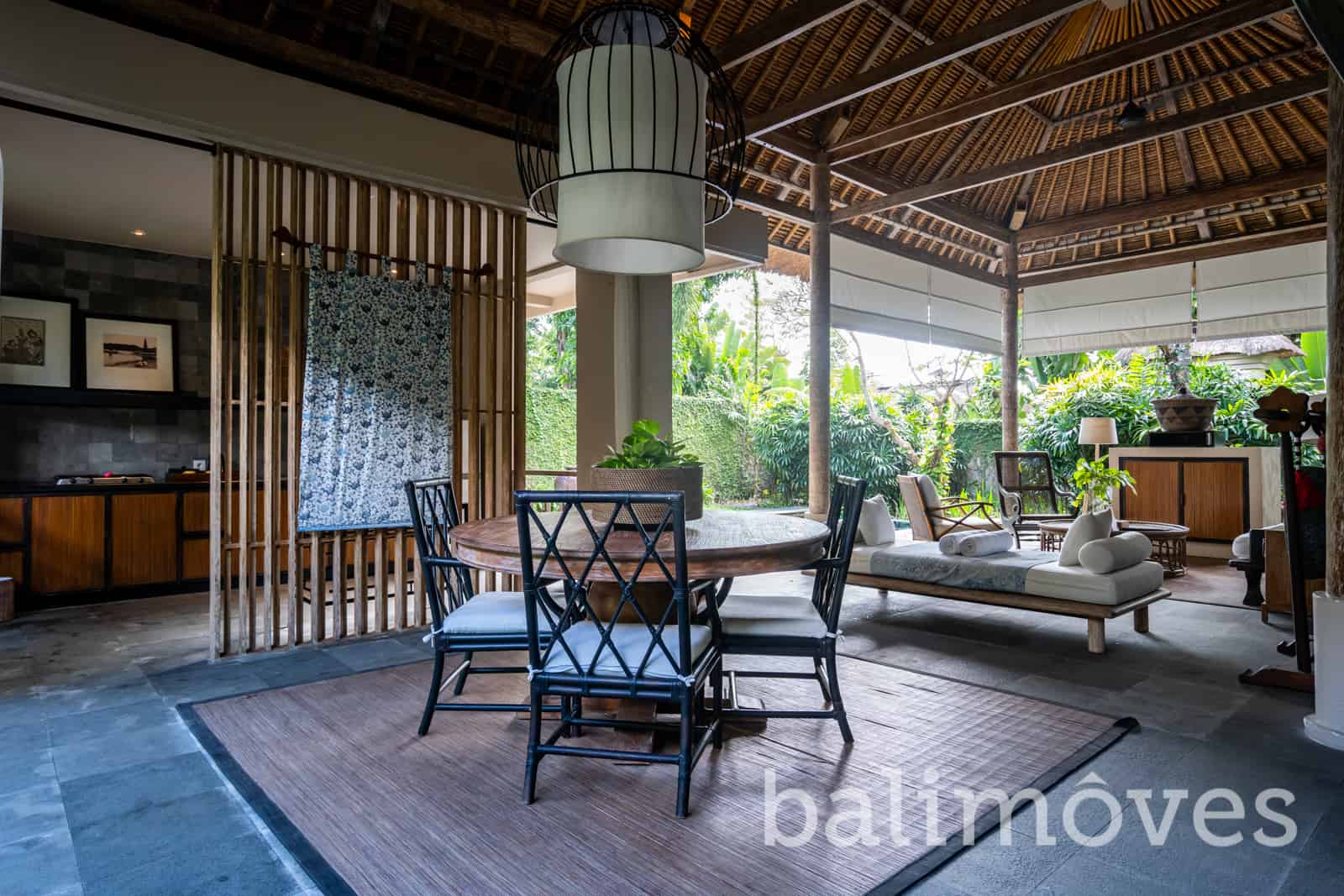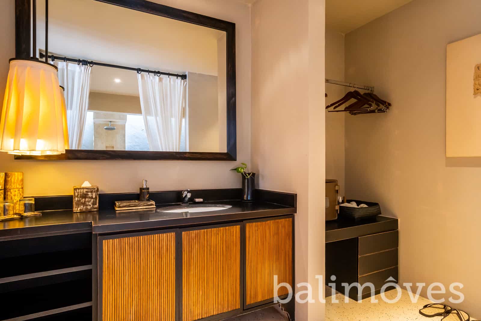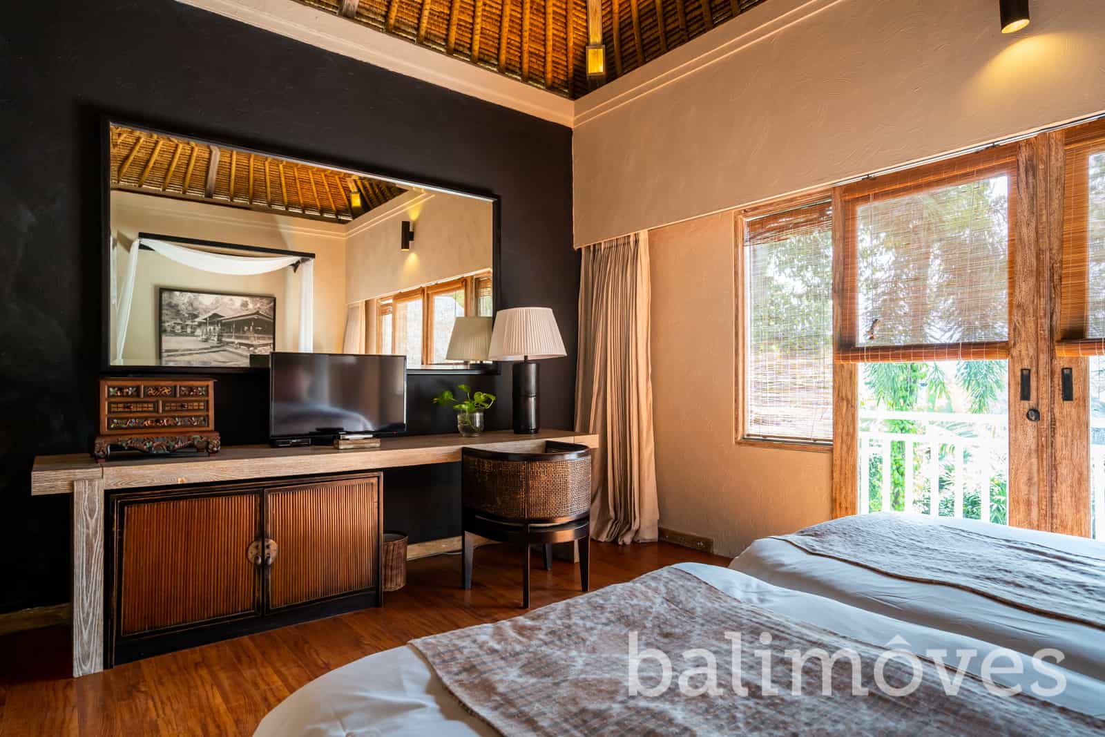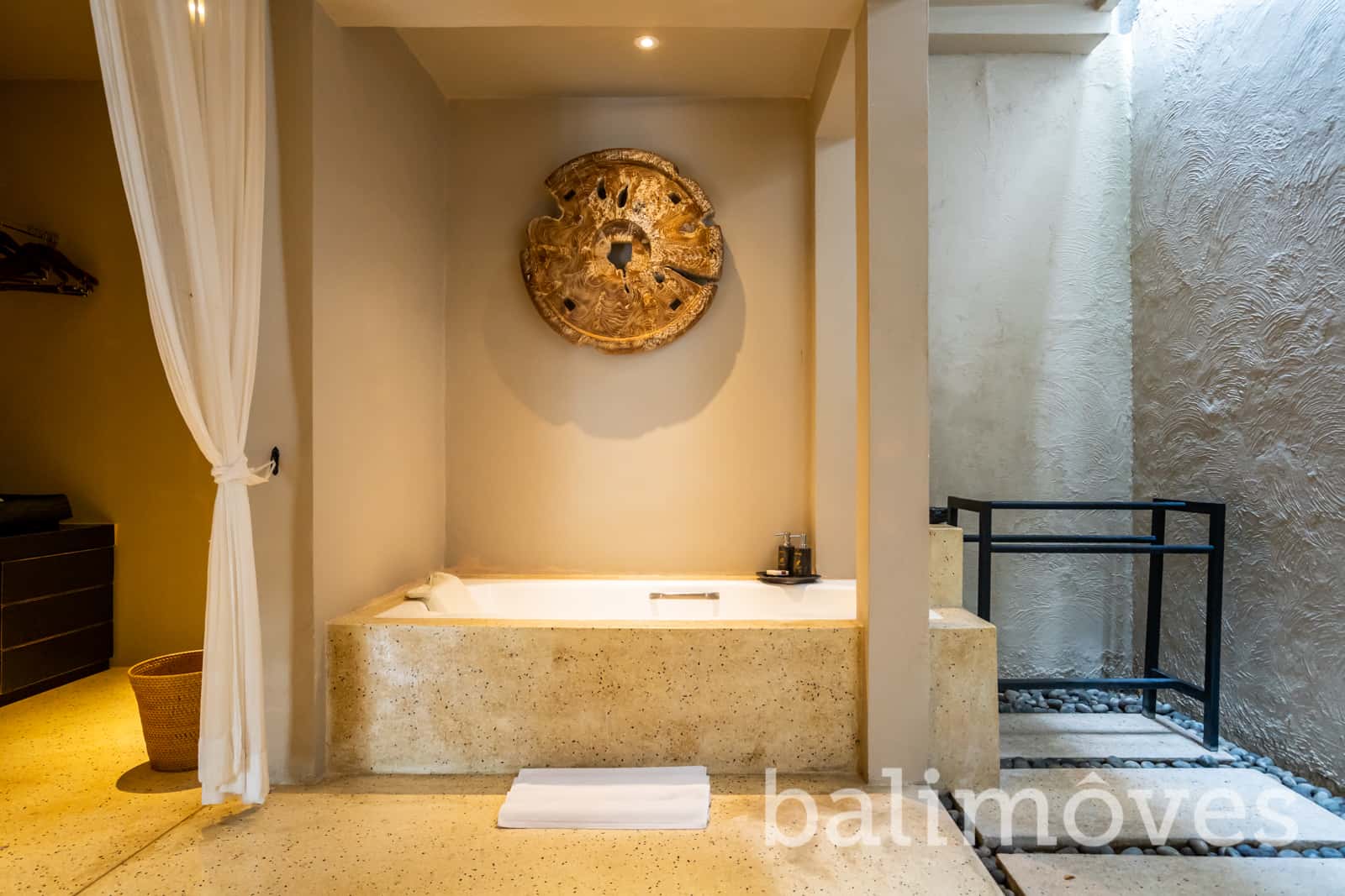 The property was built in 2017 on the 4 are plot land and 2 are building size, this villa has a modern design with an open living concept, coming out with Alang Alang roof (thatched roof). The living area is attached with a cozy couch with a pool view this space is connected as well to the dining area as you can see above, the villa also offers one guest toilet, an open-air minimalist kitchen that coming out with HOB and fridge, one master bedroom which located on the first floor offers furnished with an ensuite bathroom fitted with bathtub and shower, second bedroom located just above the master bedroom, yes! it is located on the second floor, it is bright and offers furnished as well with a twin bed, a big mirror attached on the wall and large size of the teak wooden table that you can use as a working space, it has an ensuite bathroom fitted with shower this room have a private balcony.