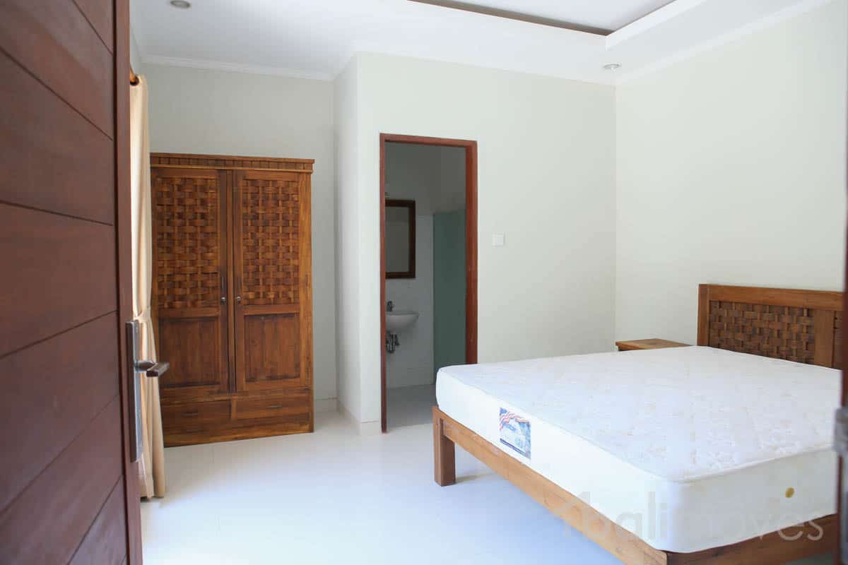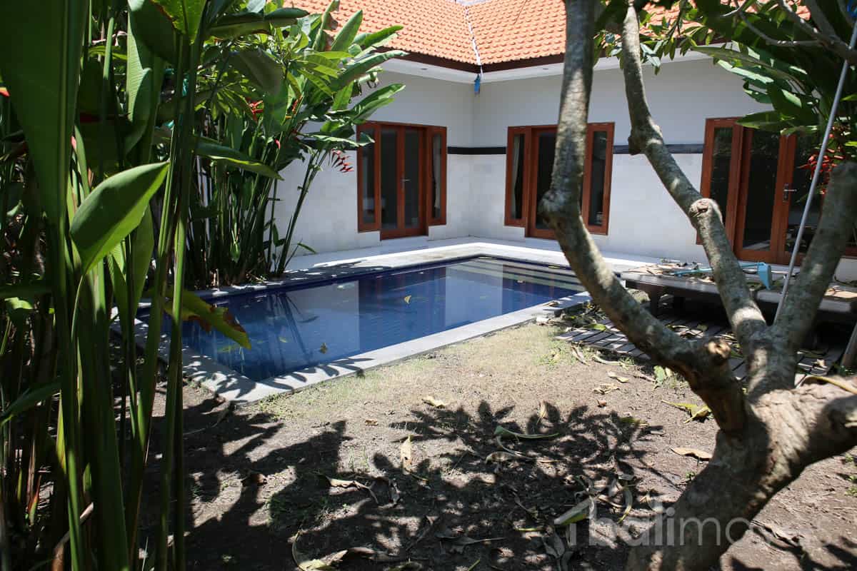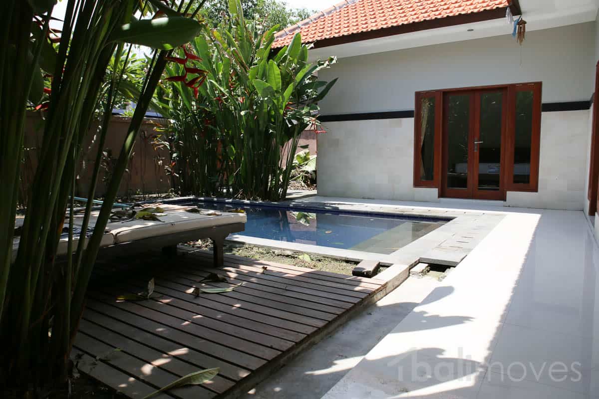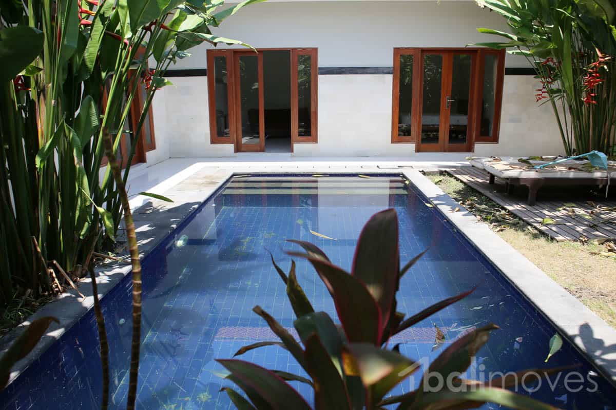This is a pretty standard two bedroom villa built around a swimming pool. Combined living area and kitchen, each bedroom with ensuite bathroom, clean, bright, and modern. Tucked away behind a popular main road just west of the Bypass. Good location, reasonable price, a blank canvas for anyone looking to make a nice, easily maintained home in Sanur.