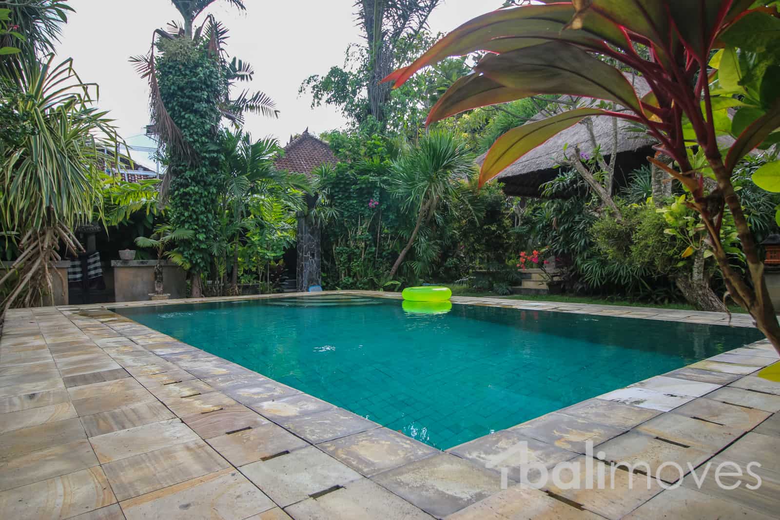 This villa is really unique, where you can feel the traditional Balinese vibe because of the spacious garden with a lot of plants, an open living area, an open air bathroom, classic wooden bed frames. It was built on 800 m2 land, 300 m2 building size, and has 2 main bedrooms & 2 main bathrooms, 1 maidroom & bath, western standard kitchen, 5500 watt electric power, city water ( PDAM ), 2 cars parking, 5 x 8 meter pool.