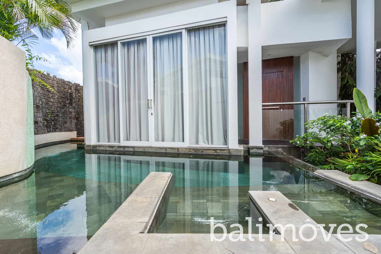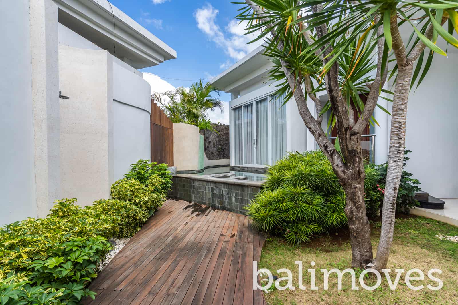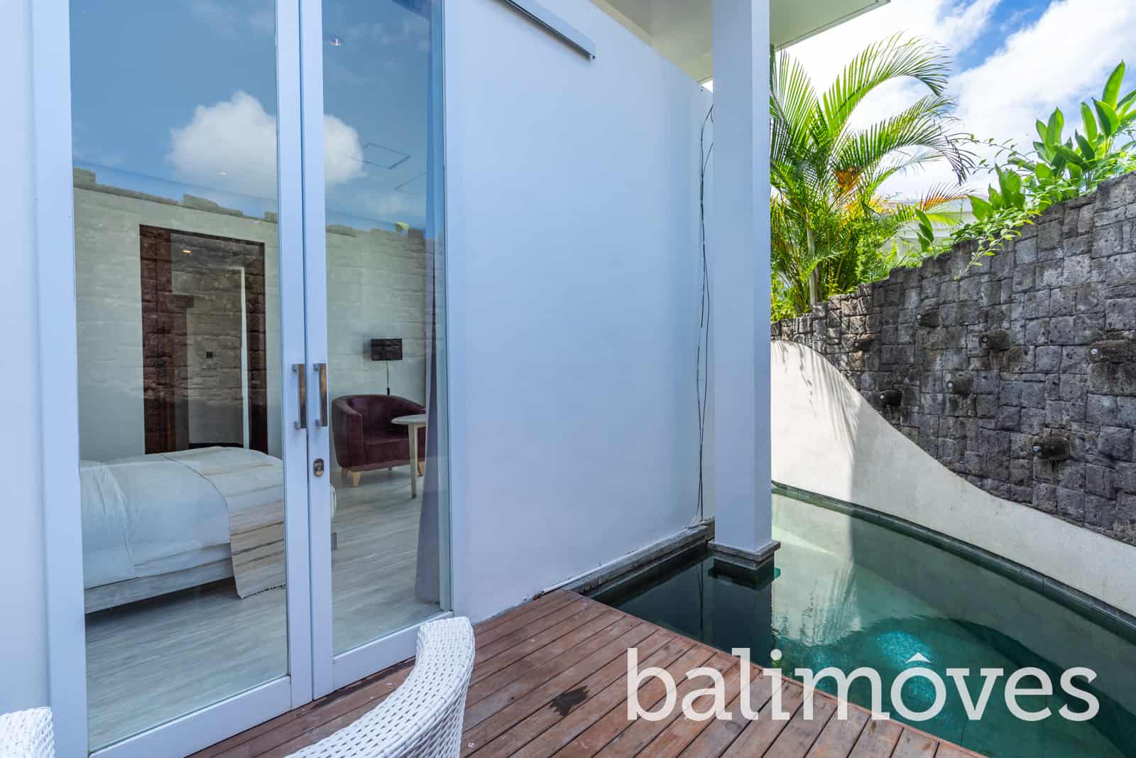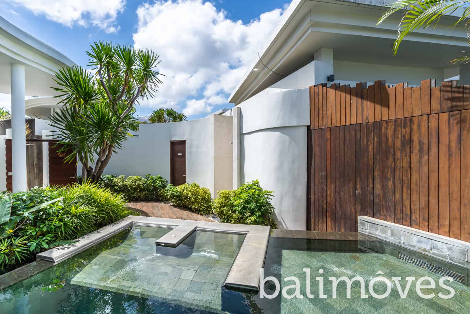 Switching from a strategic location, let’s take a look at how stunning the style of this villa building is. With a full fence wall and also high, this villa is built elongated and almost resembles a semicircle shape. The concept of an open kitchen and living room overlooking the courtyard. Then it is connected to the swimming pool by a wooden walkway. This mini swimming pool is right in front and spreads to the side of the room of this house. The rooms of this house are designed to be very comfortable and luxurious, equipped with a walking closet and also a beautiful bathtub. Only has 1 room, this villa is perfect for living alone or with a partner. With a good environment, and great privacy, this villa is a good choice for Seminyak.