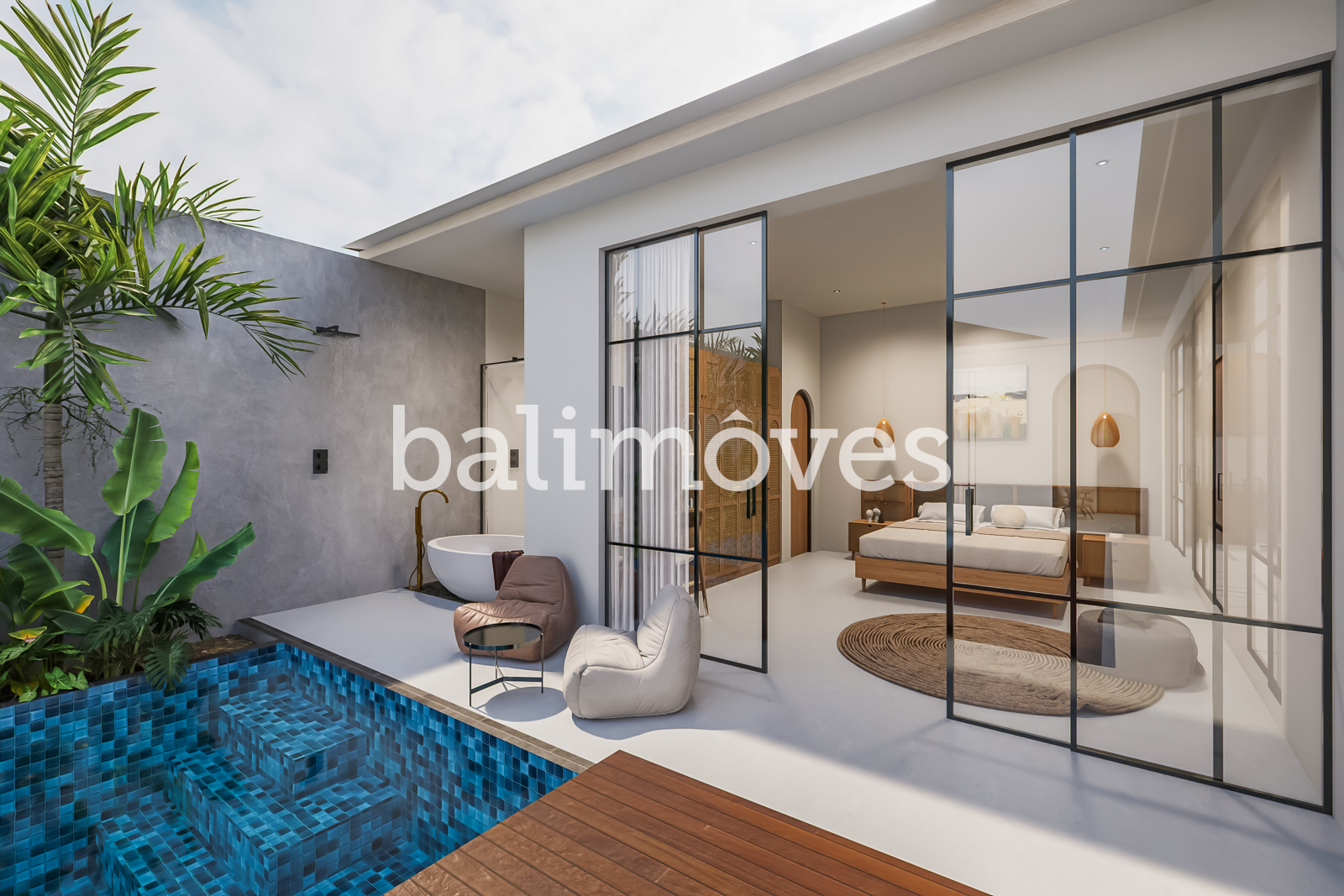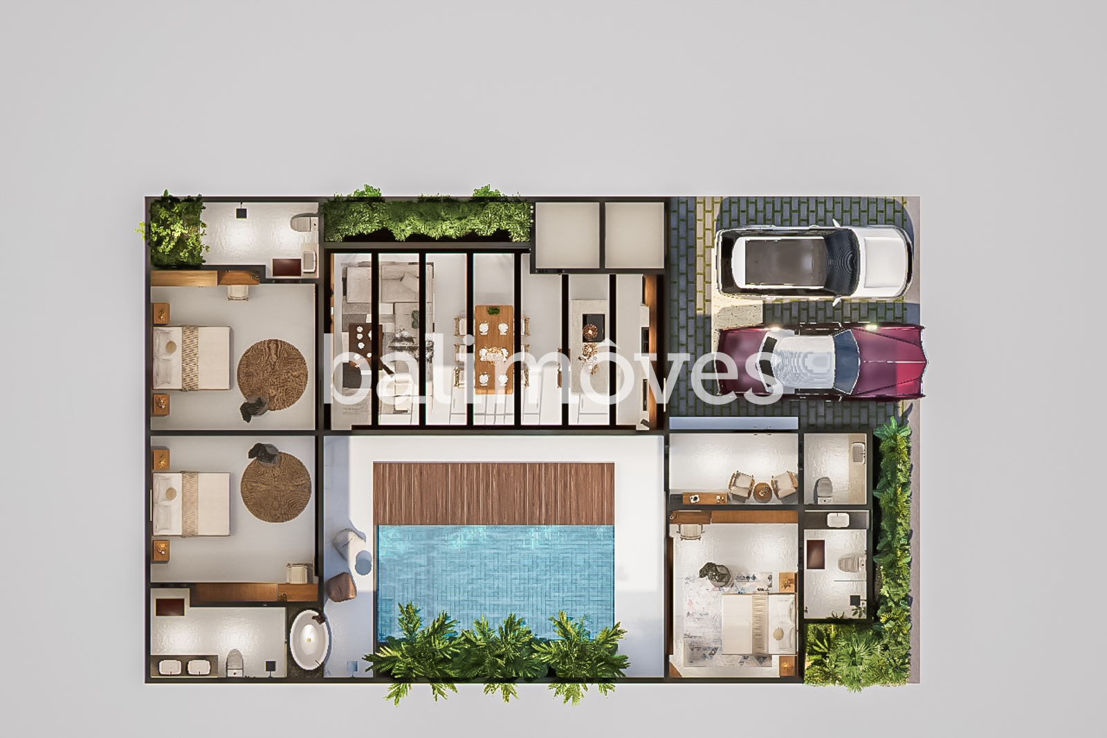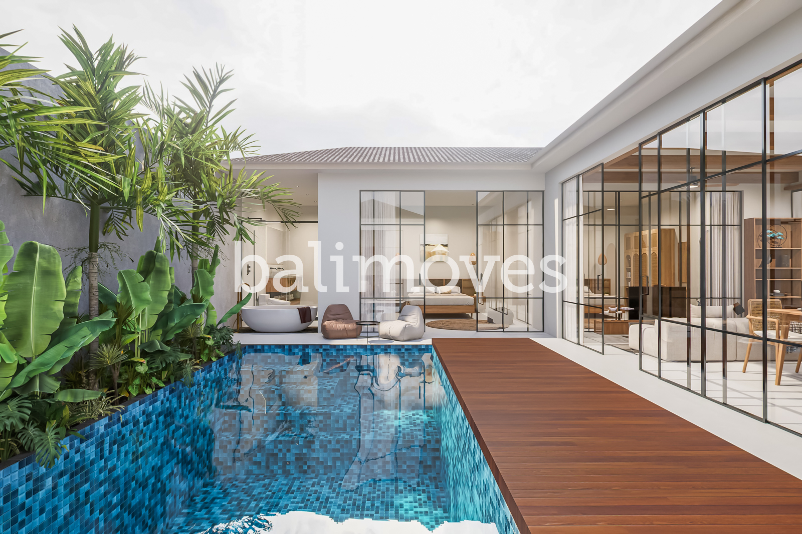 The heart of the villa is the private swimming pool, framed by a stylish wooden deck and lush greenery, making it an inviting spot to relax. Large sliding glass doors provide a smooth transition between indoor and outdoor living. Additional highlights include a private parking area for two cars.